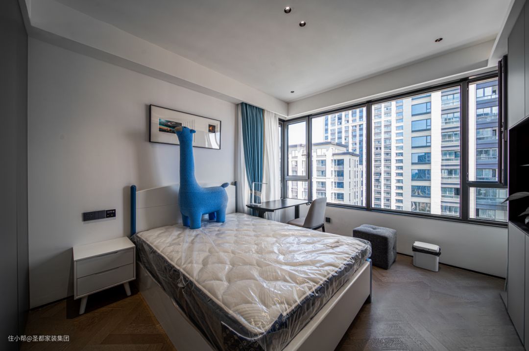 次卧,以沉稳大气为主要的设计基调,木质背景墙面选择字画作为装饰,烘托了文艺气息和主人的殷殷祝福。开放式栅格搭配灯带,实用又美观。 儿童房空间布置简单却实用,只有一张床,一张书桌,以及一套衣柜,满足日常收纳与休息需求。蓝白配色,让整个空间更加轻松明亮。
