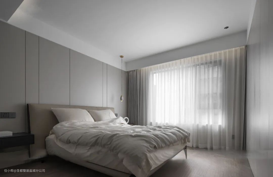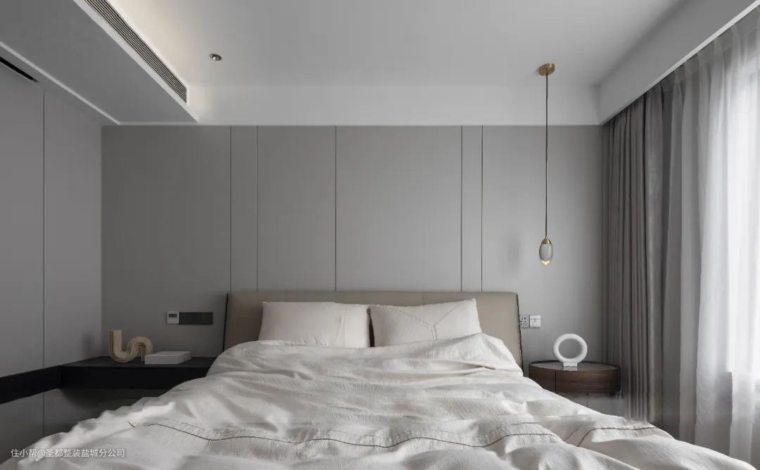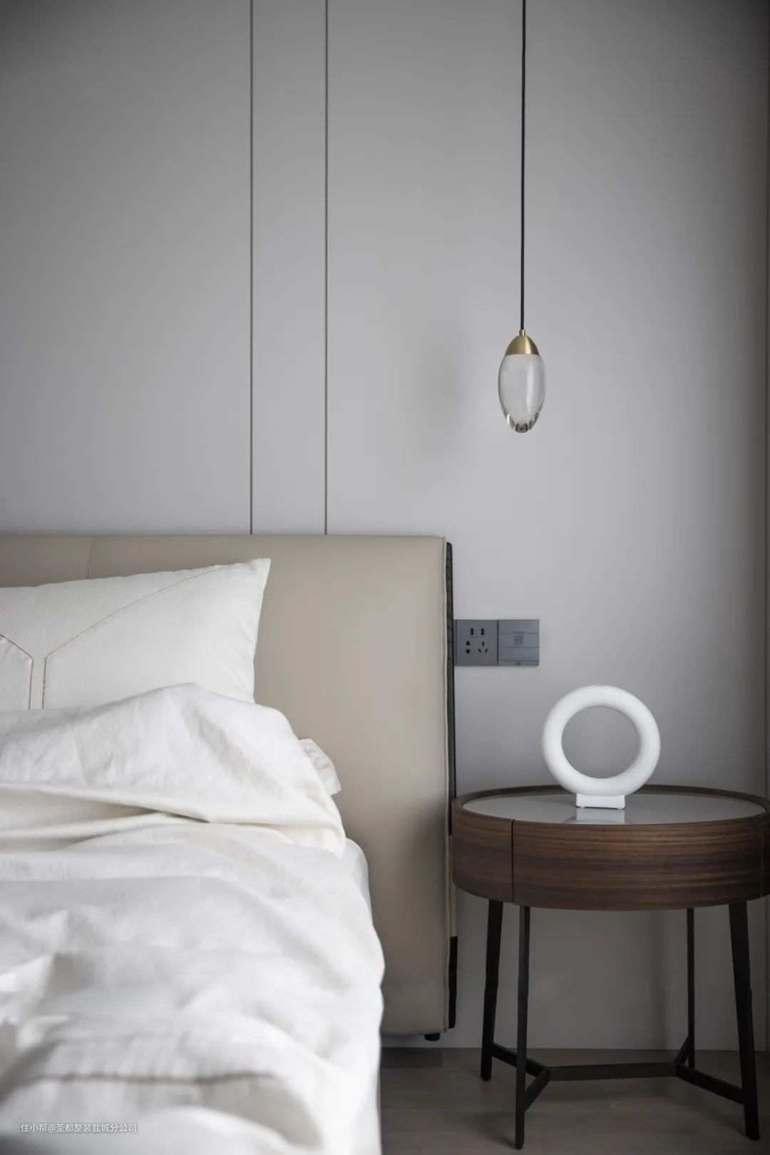 主卧的设计以简驭繁,背景选用灰色的护墙板,悬空床头柜传达留白意境,与衣柜的雅致清淡,相映成趣。长虹玻璃移门必要时让主卧成为独立环境,床品选用了淡雅静穆的色调,安心定神,排遣烦闷。从简约自然、舒适自律的感觉出发,并辅以浅色系的搭配,为业主打造现代优雅的居住空间。