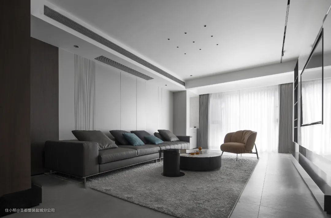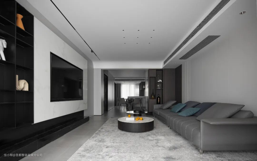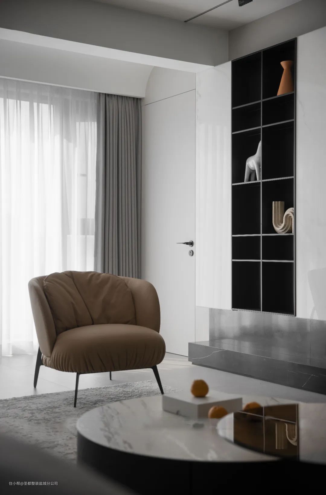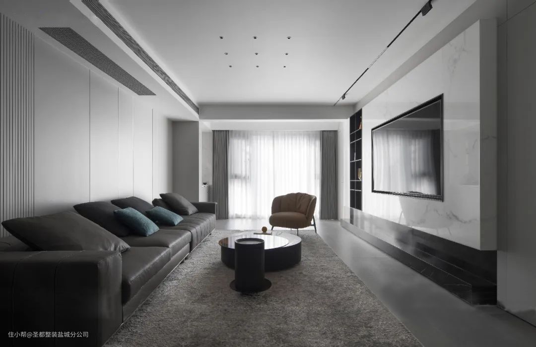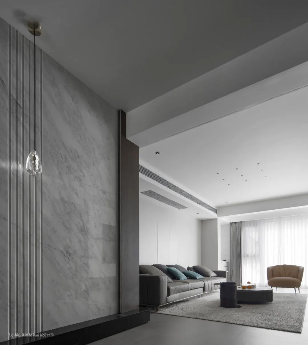 入门映入眼帘的是玄关的大理石和现代风的吊灯,若隐若现的水墨纹路附着有规律的拉槽。寓静于境。整个空间中色彩的运用简单纯粹,以典雅的白为主基调,灰色穿梭于空间衡量边界。 木质元素与线条赋予客厅多重质感的交错,无主灯设计的布局随性却不随意。大象灰沙发的细腻质感,与铺排大面积哑光砖地面形成呼应。岩板的茶几和沙发旁的深色酒柜,冷硬中裹挟着温存,张弛得宜。 电视背景墙将白色大理石与白色隐形门结合,与整体空间相连贯,衬托空间雅致与沉稳的气质,保留了传统的电视机边柜,以简单的装饰品进行点缀,整个背景显得更加丰富。隐形门满足了主人家的日常生活功能需求与空间场景的转换。 橙色沙发色彩跳脱出空间,带来的视觉冲击力,自成家的解忧曲。