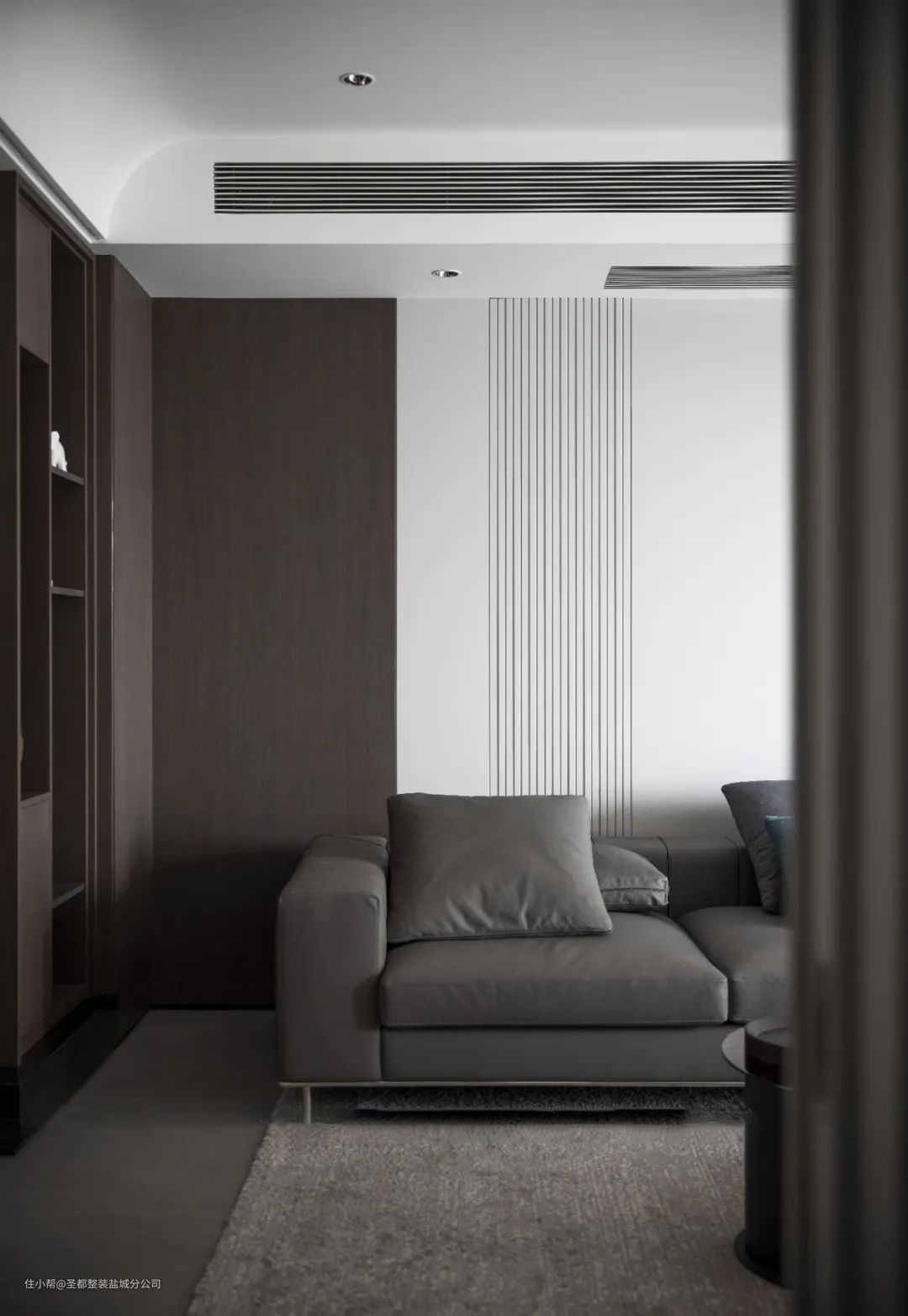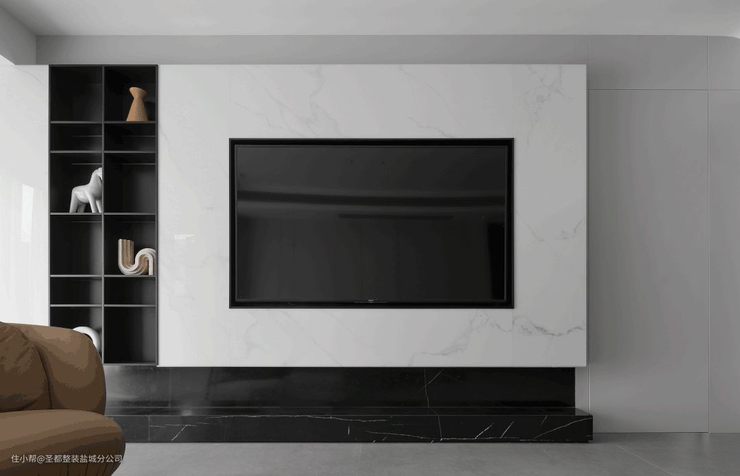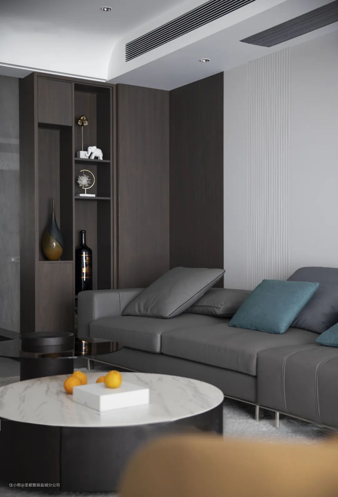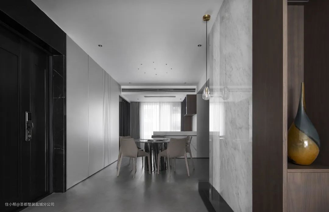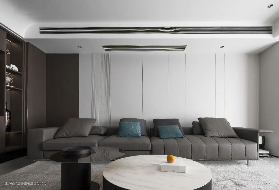 入门映入眼帘的是玄关的大理石和现代风的吊灯,若隐若现的水墨纹路附着有规律的拉槽。寓静于境。整个空间中色彩的运用简单纯粹,以典雅的白为主基调,灰色穿梭于空间衡量边界。 木质元素与线条赋予客厅多重质感的交错,无主灯设计的布局随性却不随意。大象灰沙发的细腻质感,与铺排大面积哑光砖地面形成呼应。岩板的茶几和沙发旁的深色酒柜,冷硬中裹挟着温存,张弛得宜。 电视背景墙将白色大理石与白色隐形门结合,与整体空间相连贯,衬托空间雅致与沉稳的气质,保留了传统的电视机边柜,以简单的装饰品进行点缀,整个背景显得更加丰富。隐形门满足了主人家的日常生活功能需求与空间场景的转换。 橙色沙发色彩跳脱出空间,带来的视觉冲击力,自成家的解忧曲。
