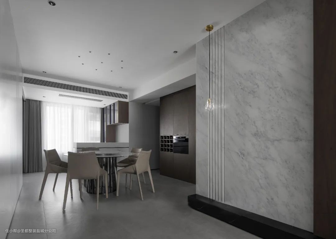 光面皮革单人椅,深色的餐边柜,提供了舒适的用餐环境,纯净中沉淀质感,整体空间具有一致性。餐厅以深浅色调相呼应,开发商预留的餐厅太窄,放圆桌太过于拥挤。设计方案将餐桌往主卧方向推,在承重墙的地方设以大理石吧台,增添了人与空间的互动感。
