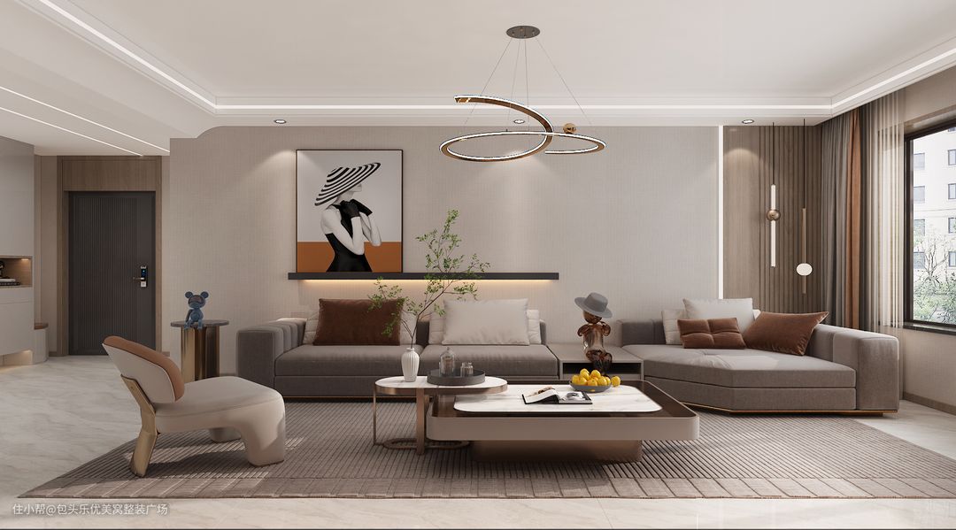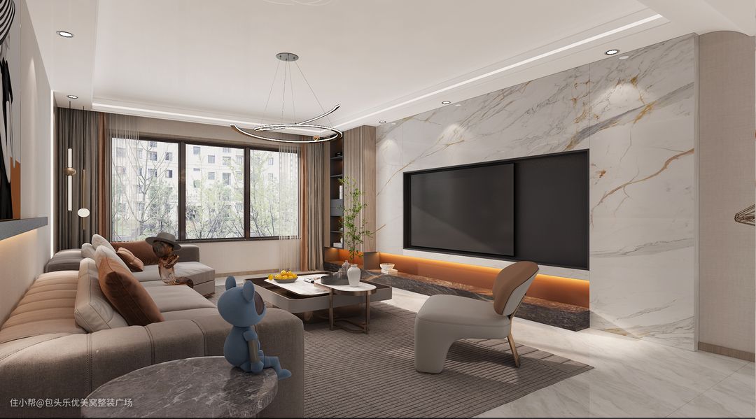 入门瞬间,首先印入人眼帘的是简约的设计风格及颜色上的丰富运用,奶茶色的墙面经过橙色的穿插,以及装饰画的点缀,给人产生了一种莫名的亲切感与协调感。 简易的长形木质电视柜与高级的大理石背景墙的搭配提升了整个空间的高级感。