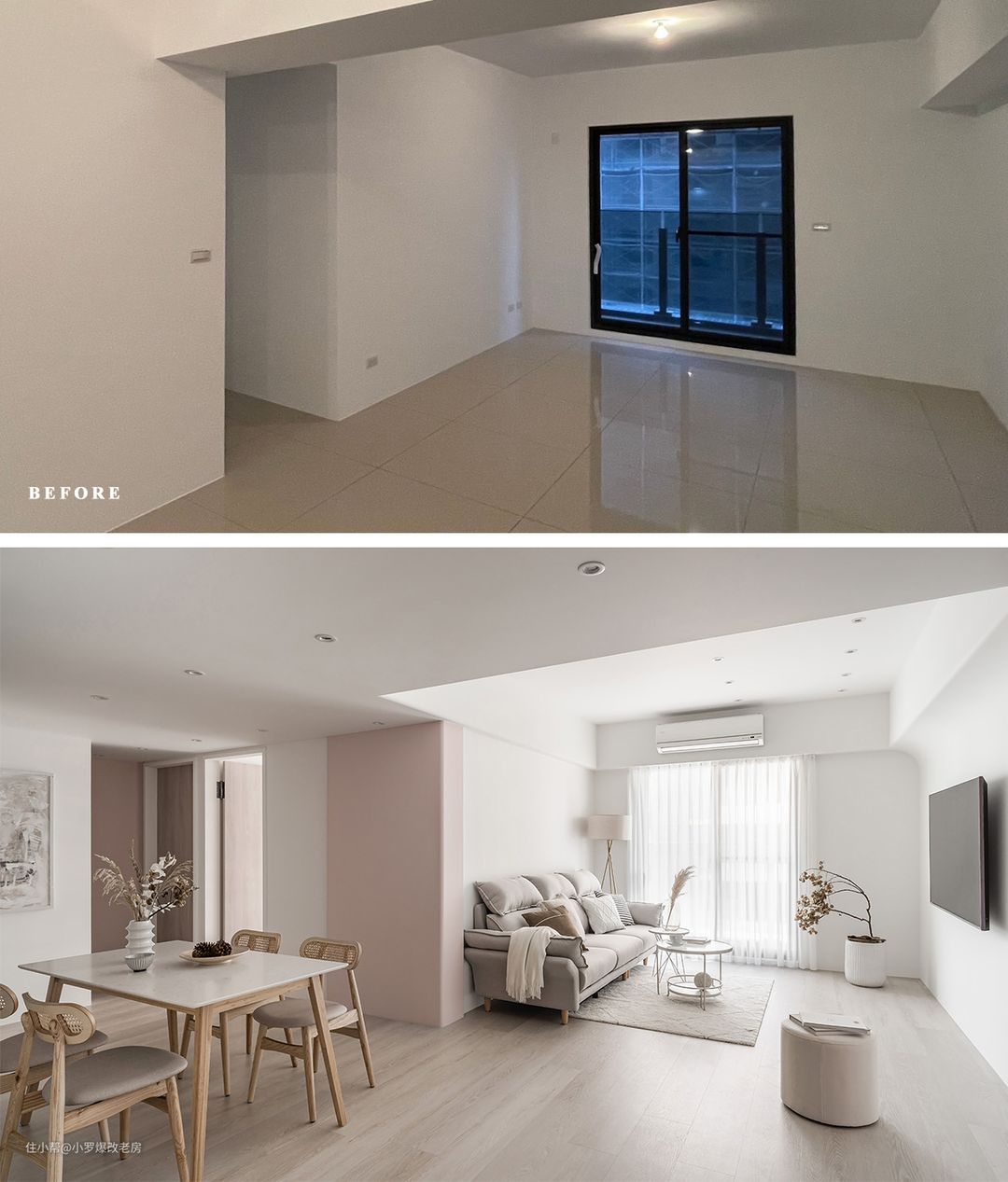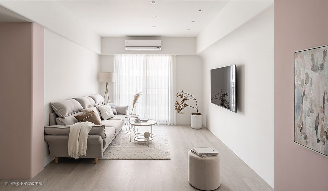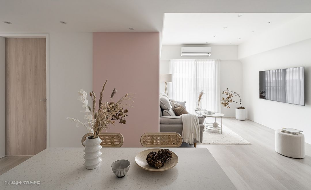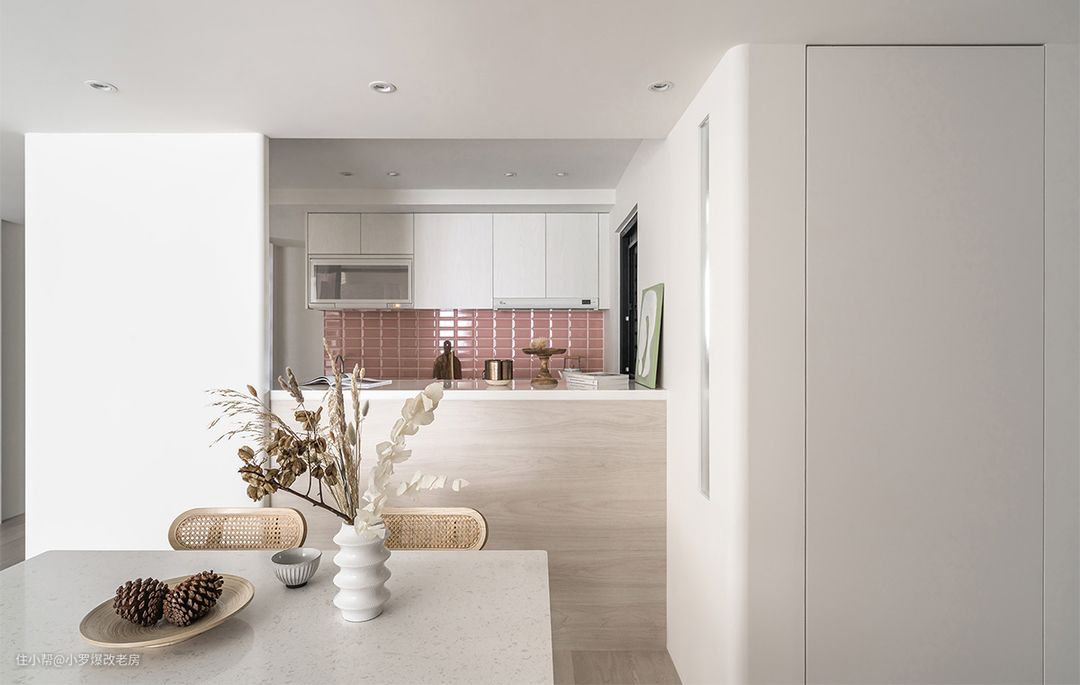 经过精心设计和施工,我们成功克服了低梁贯穿的挑战。设计师巧妙地采取了“拉长宽度”的策略,撤掉了一间狭小的房间,瞬间释放了家宅的尺度。同时,通过善用跳色、转移视觉焦点等手法,弱化了横梁的存在感,顺利扭转了进屋后的阻滞感。 在色彩运用上,我们大量采用了留白作为基底,并揉入了主人钟爱的玫瑰色。这种柔和雅致的粉色系,不同于奔放艳丽的亮红,它以温润感缓缓蔓延,化作一股温柔的力量。 在餐厅一侧的结构柱体、入门45度角的墙体以及浴厕前的立面上,我们都铺叙上了这种自带仙气的柔粉色,形成了三个重点色块,使得空间更加立体而富有层次感。 此外,我们还巧妙地在纯白与粉调的和谐奏鸣中点缀了古铜金元素,这种闪耀的光泽感为空间增添了些许轻熟大人味。它低调而不张扬,甜而不腻,展现出若隐若现的美丽存在,使得整个空间更加优雅而富有质感。