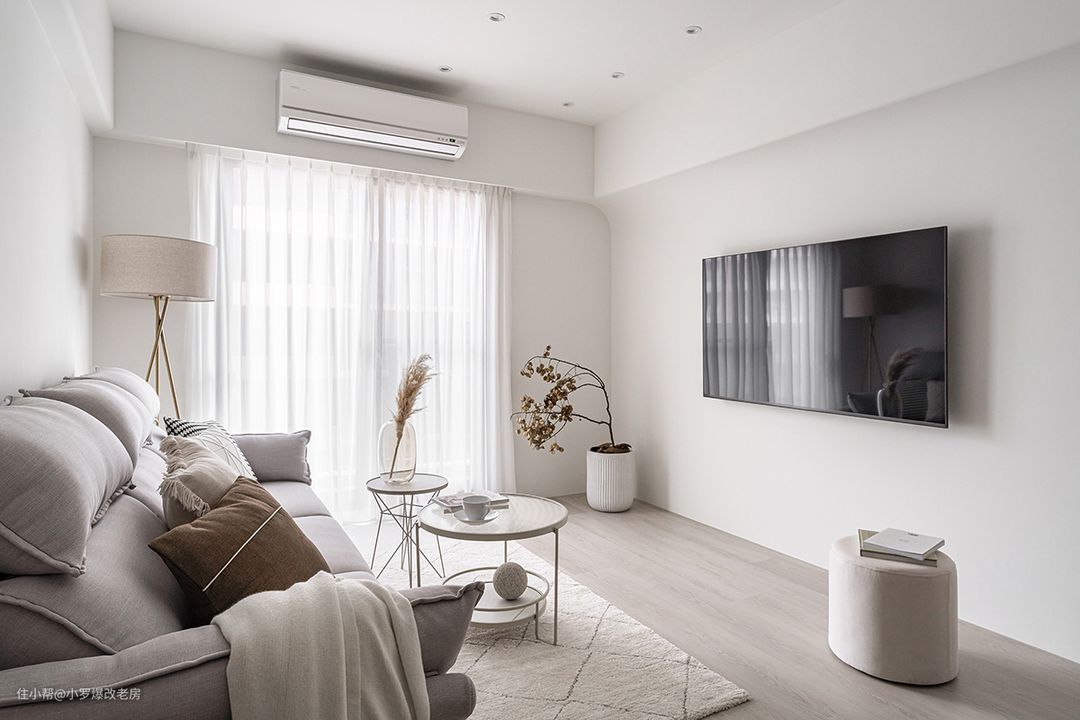 设计师巧妙地将大面积的采光空间留给了公共区域,让温暖的日光透过轻柔的纱帘洒落,营造出一片纯净无暇的空间。这样的设计不仅使得整个空间明亮通透,更增添了一份宁静与舒适。 在公共区域的电视墙设计上,设计师采用了流畅的弧线型交界,展现出了简约而不失个性的现代感。电视墙以率性的纯白色为主,拒绝了冗余的装饰,彰显了简约主义的精髓。同时,考虑到屋主少用3C产品的生活习惯,这样的设计也更符合实际使用需求。