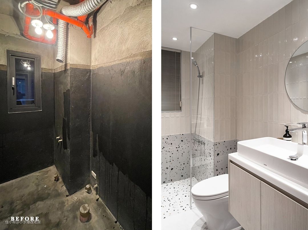墙面别出心裁地采用了磨石子瓷砖,不规则跳跃的缤纷点状设计,宛如一幅抽象的艺术画作,让人眼前一亮。这种设计不仅增添了空间的活力与趣味性,还成功塑造了可爱又不失轻熟女韵味的空间氛围。圆镜的巧妙运用,通过其反射特质,进一步拓宽了视觉空间,使得整个空间显得更为敞亮。奶茶色的点缀,不仅与磨石子瓷砖形成了和谐的色彩搭配,还提升了空间的温馨感,让人倍感舒适。