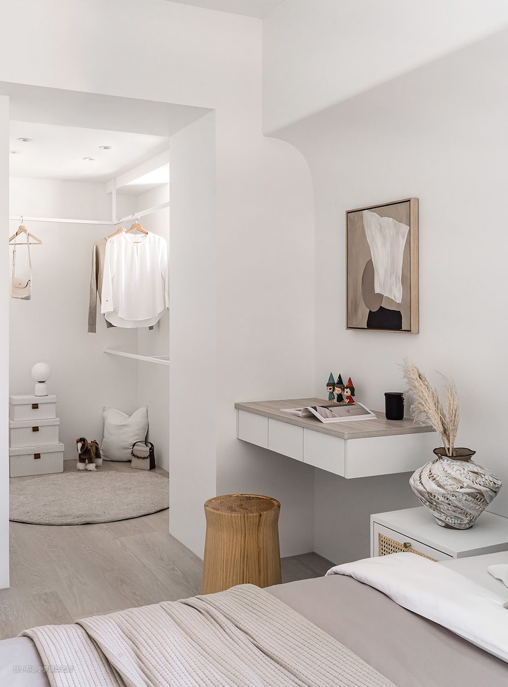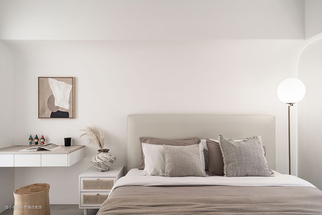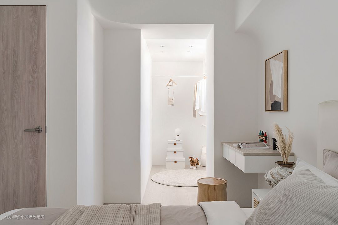 我们的设计以自在舒适为最大原则,致力于打造一个沉浸于放松休息的纯净空间。我们摒弃了多余冗杂的堆叠,力求还原主人所向往的简洁而宁静的睡卧眠区。 在空间布局上,我们巧妙地延续了公区的纯粹感,运用留白与圆弧的设计手法,将天花收折成一曲柔弧,不仅消弭了床头处横梁压床的疑虑,更增添了一份优雅与舒适。这种设计既体现了我们对细节的精致追求,也展现了我们对居住者舒适体验的深刻理解。 此外,考虑到主卧不需要主卫,我们将这部分空间腾出作为更衣室,既增加了空间的实用性,又保持了整体设计的和谐与统一。