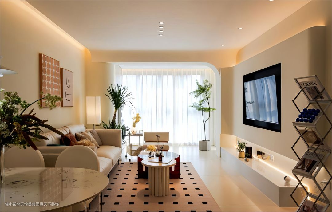 宅家的每一刻都被治愈☺️ 奶油色调打底,石材通铺地面 温柔、慵懒、纯粹、惬意... 这才是你的梦中情屋本屋!! ┈┈┈┈┈┈ ⚡️ 🔸全屋通铺柔光砖,不要过门石不要门套 🔸拉通客餐厅和阳台,阳台做成休闲晾晒区 🔸客厅走简单的弧形吊顶,不做复杂的吊顶 🔸无主灯设计,大气又温暖 🔸客餐厅一体完美诠释 🔸色调统一,奶白色系真的显大又温柔 🔸提前预留好嵌入式家电的尺寸,洗衣机之类的都可以完美嵌入 超美的现代奶油风镂空电视墙设计,会让你的家瞬间高级感满满!🌟👥 我们采用了独特的奶油色系,给人一种温馨、舒适的感觉。🌈💕而且,这种颜色搭配起来非常百搭,无论是家具还是装饰品都能很好地融入其中。👍🏻👌 其次,上下镂空灯带的设计让整个空间显得更加通透,同时也能增加一些艺术气息。🎨🖼️而且,这种设计还能让电视墙看起来更加有层次感,让人一眼就能感受到设计师的用心。👏🏻👏🏻 最后,我们来谈谈这款设计的实用性。🤔🔍虽然这款设计看起来很美,但是它也非常实用。镂空的设计可以让电视墙在视觉上变得更加轻盈,同时也能让空气流通,让家里保持一个舒适的环境。🍃🌞 奶油风最直观也是最核心的特征在于: 1. 整体空间的硬装,简单干净直爽 2. 软装却是温柔,质感细腻的高级感 3. 软硬装相互协调,色调统一 4. 造型和材质上凸显可爱软萌的气质 ✨色彩上 奶油色是一种淡淡的奶咖色,在米白色与奶咖色之间的色系,奶油色是一个低饱和度的配色风格。在此基础上,再搭配米色、暖灰色、原木色等其他饱和度比较低的色彩,最后再用一些带有重色的家具、木料或墨绿的植物,起到对比和突出的视觉效果,奶油色可以和现代极简,侘寂,日式,法式等灵活的结合。 ✨材质上 材质方面为了符合奶油系风格的调性,在选择上,一定要尽量选择肌理感较强的材质,比如羔羊绒、珊瑚绒、棉麻、原木等材质最为适合。 低饱和度的奶油白贯穿整个空间,整体开放式布局,视觉上更显通透敞阔,地面柔光砖通铺,💫满眼都是温柔细腻~ . 电视背景墙未做繁冗装饰,每个弧度都恰到好处,🌤️简简单单却足够温馨 奶油风格的视觉作品,多以暖色调为主,设计师在客餐厅中运用大量浅色来提亮空间,突显一种身处温暖沉浸感。低对比的色彩、简单有致的线条,除了点线面的刻画,无主灯的设计带来视觉叠加,光影在简约锋利的线条间穿梭,营造慢节奏、超现实的居家氛围。