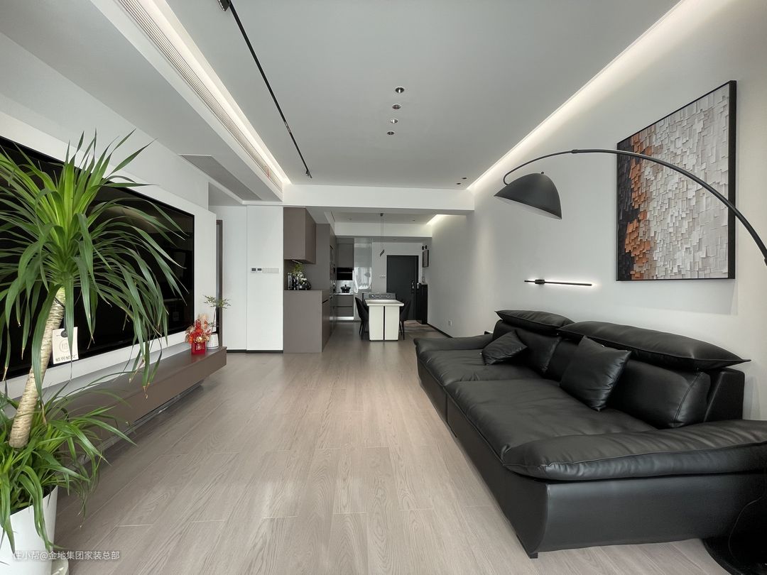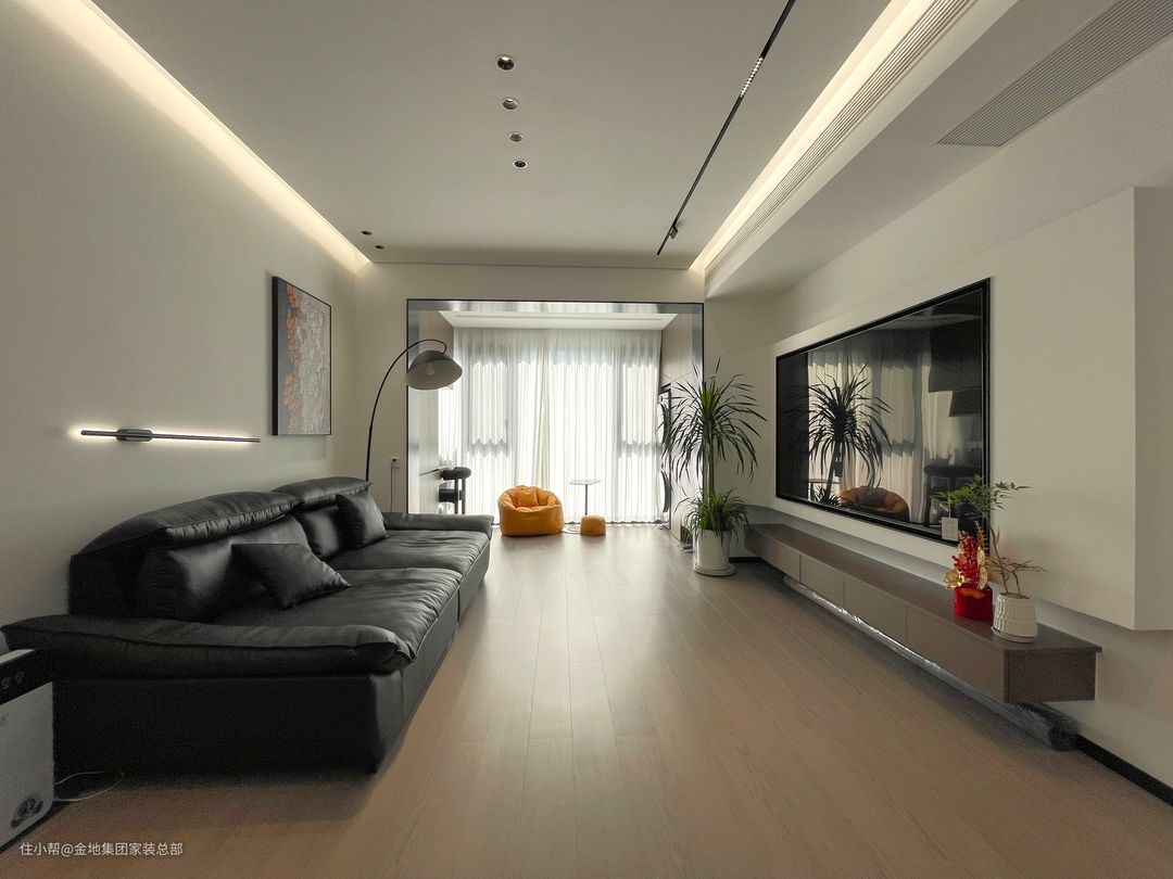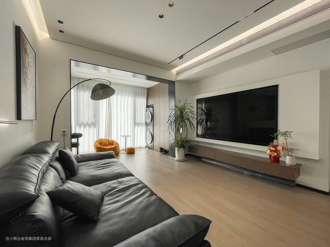 客厅与阳台相连,通铺木地板,延伸视觉空间,引入更多自然光线。 整个主空间的配色以棕木+白+黑为主色调,再来点局部的绿+橘色加以点缀,空间保持高级感的同时又不失单调。利用暖光的灯带光源,增添温馨感和舒适度。