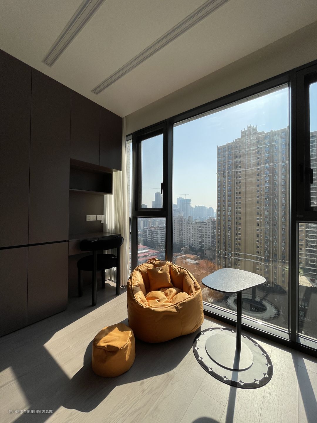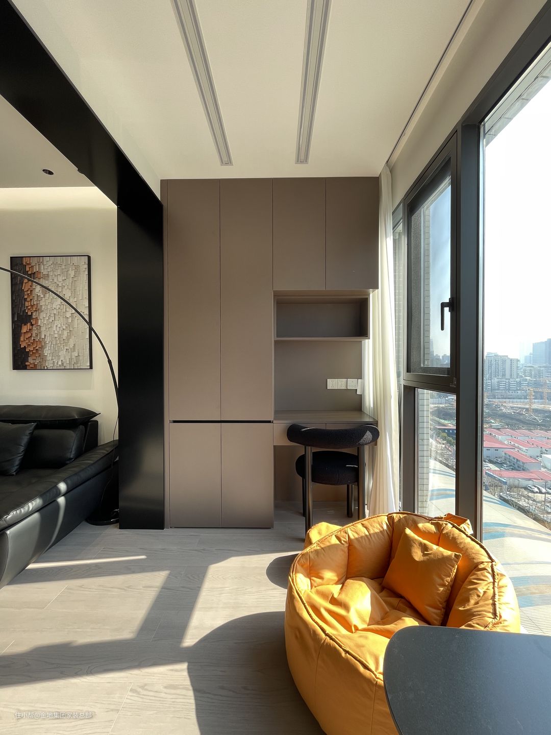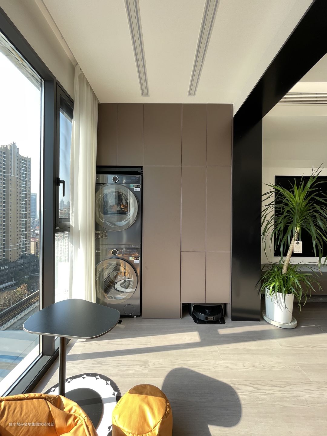 阳台与客厅打通,变身为多功能休闲区。两侧定制的顶天立地式储物柜,一侧为书桌和储物空间,另一侧整合了洗衣机、烘干机及储物柜,充分利用空间,满足收纳与实用需求。
