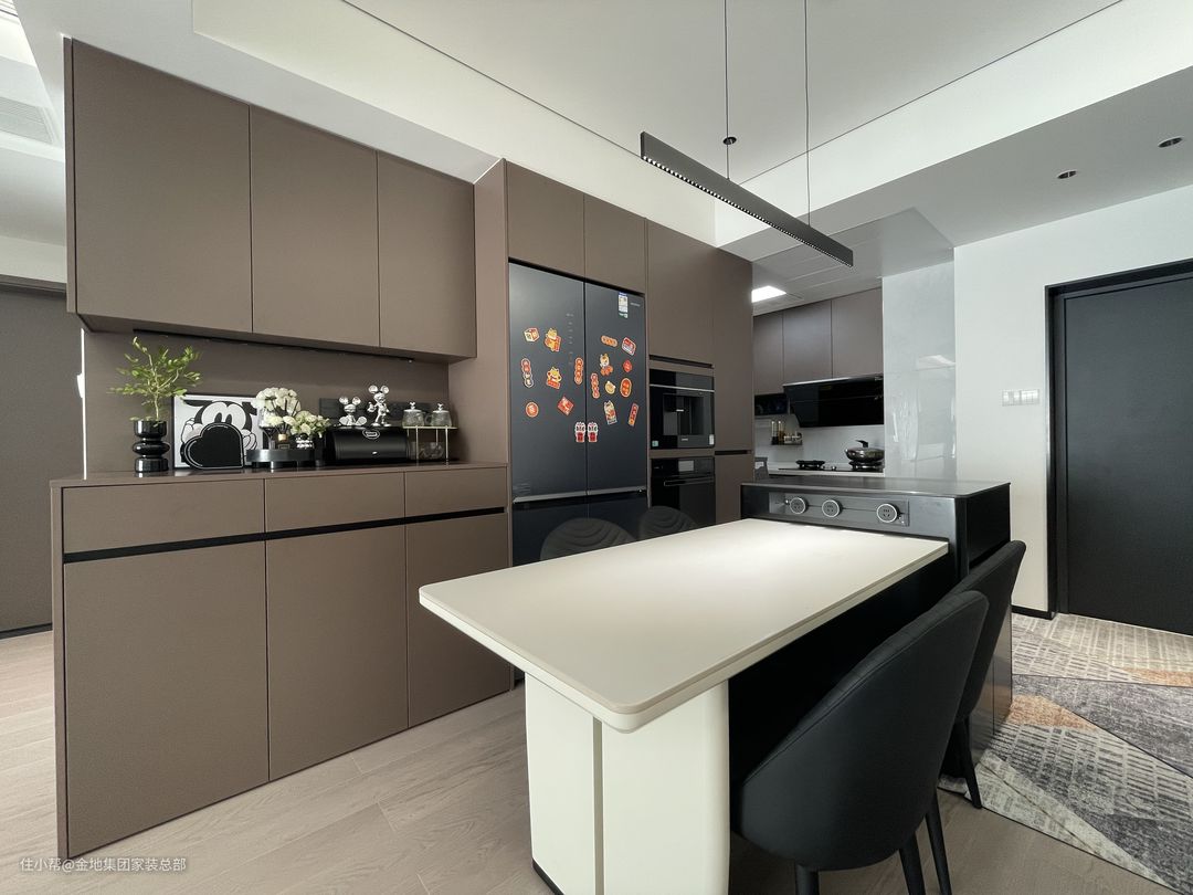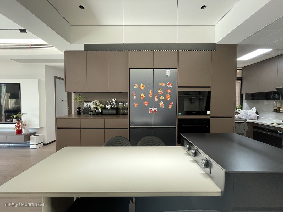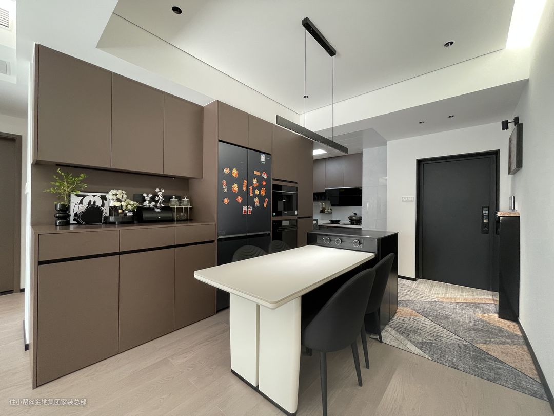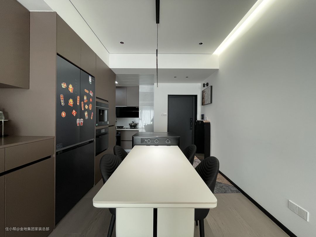 厨房打通之后,整体空间的采光好了许多,冰箱与餐边柜做了一体的设计,拿取物品也不麻烦。为了提高收纳能力,充分利用垂直空间,在靠近油烟机一侧还专门定制了黑玻透明的翻柜,可以存放常用的油盐酱醋,也增加了轻盈感。