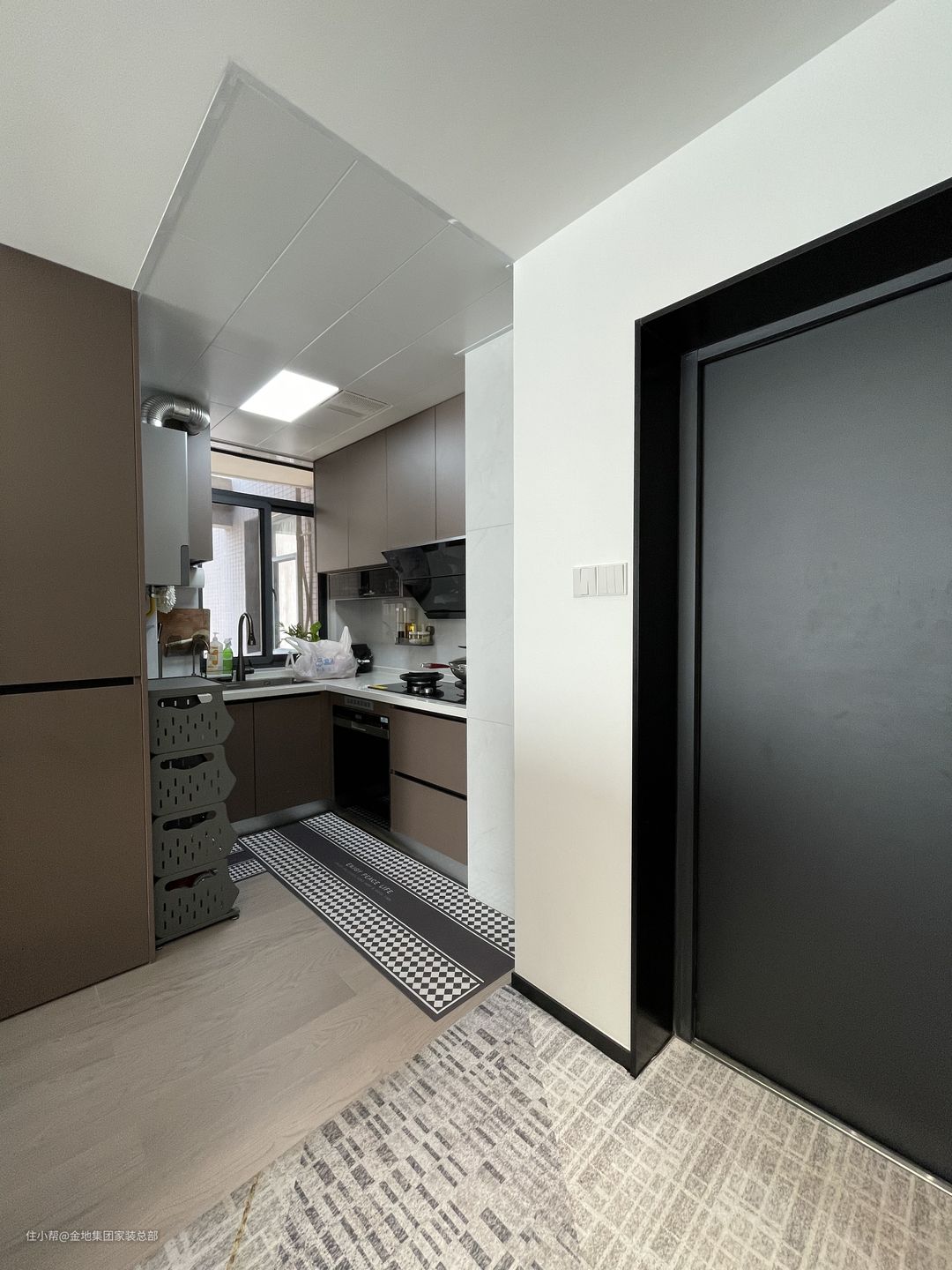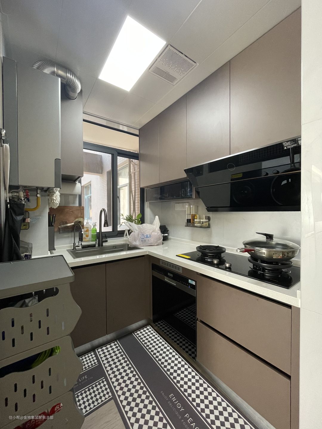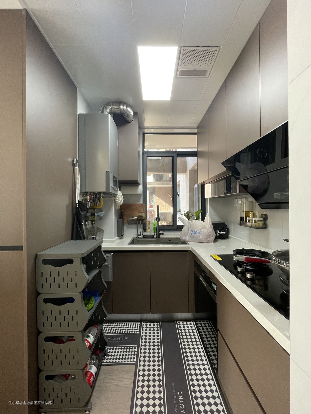 厨房打通之后,整体空间的采光好了许多,冰箱与餐边柜做了一体的设计,拿取物品也不麻烦。为了提高收纳能力,充分利用垂直空间,在靠近油烟机一侧还专门定制了黑玻透明的翻柜,可以存放常用的油盐酱醋,也增加了轻盈感。