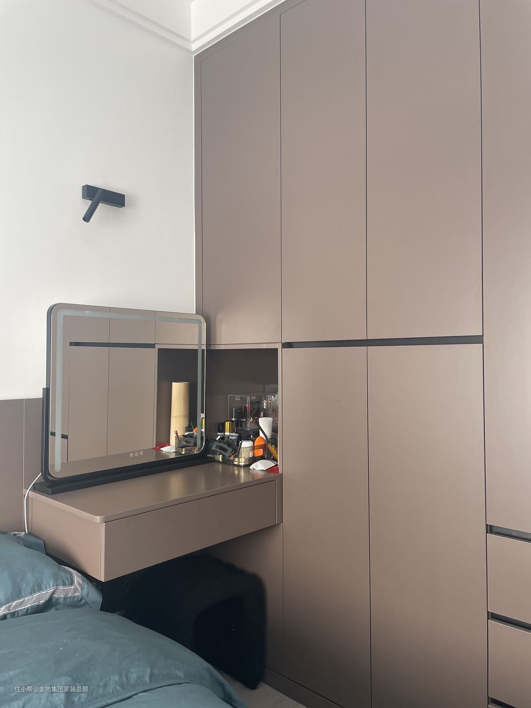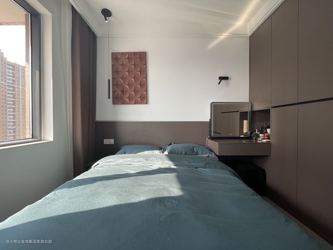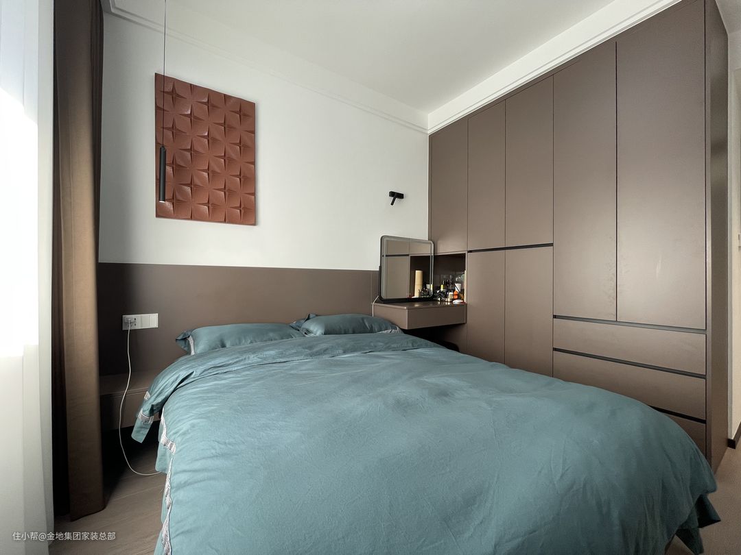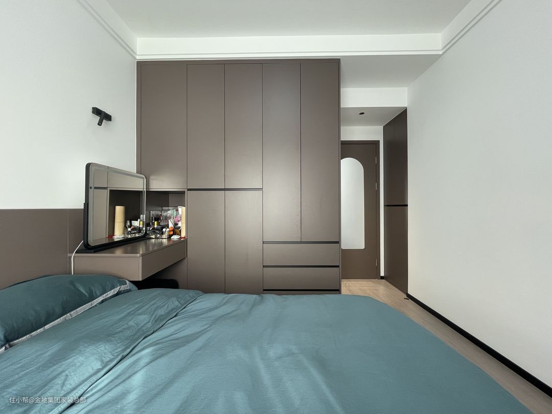 主卧以舒适为主,选用柔和的色调和简约的家具,打造宁静的休息空间。衣柜与床头柜一体的设计,提高了空间的功能;另外做简洁同色的床头板 和床头桌柜连为一体,保证了视觉上的协调统一感。