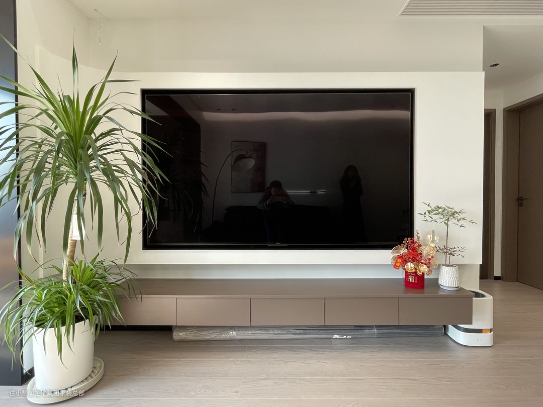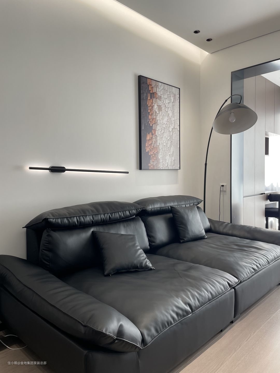 简约的沙发和电视背景墙,搭配钓鱼落地灯,营造出轻松舒适的休闲氛围;悬浮的电视柜使空间显得更加开阔和通透,给人一种简洁、现代的视觉感受。墙面点缀艺术画作,简单的一笔增添氛围感的气息和高级的装饰效果。