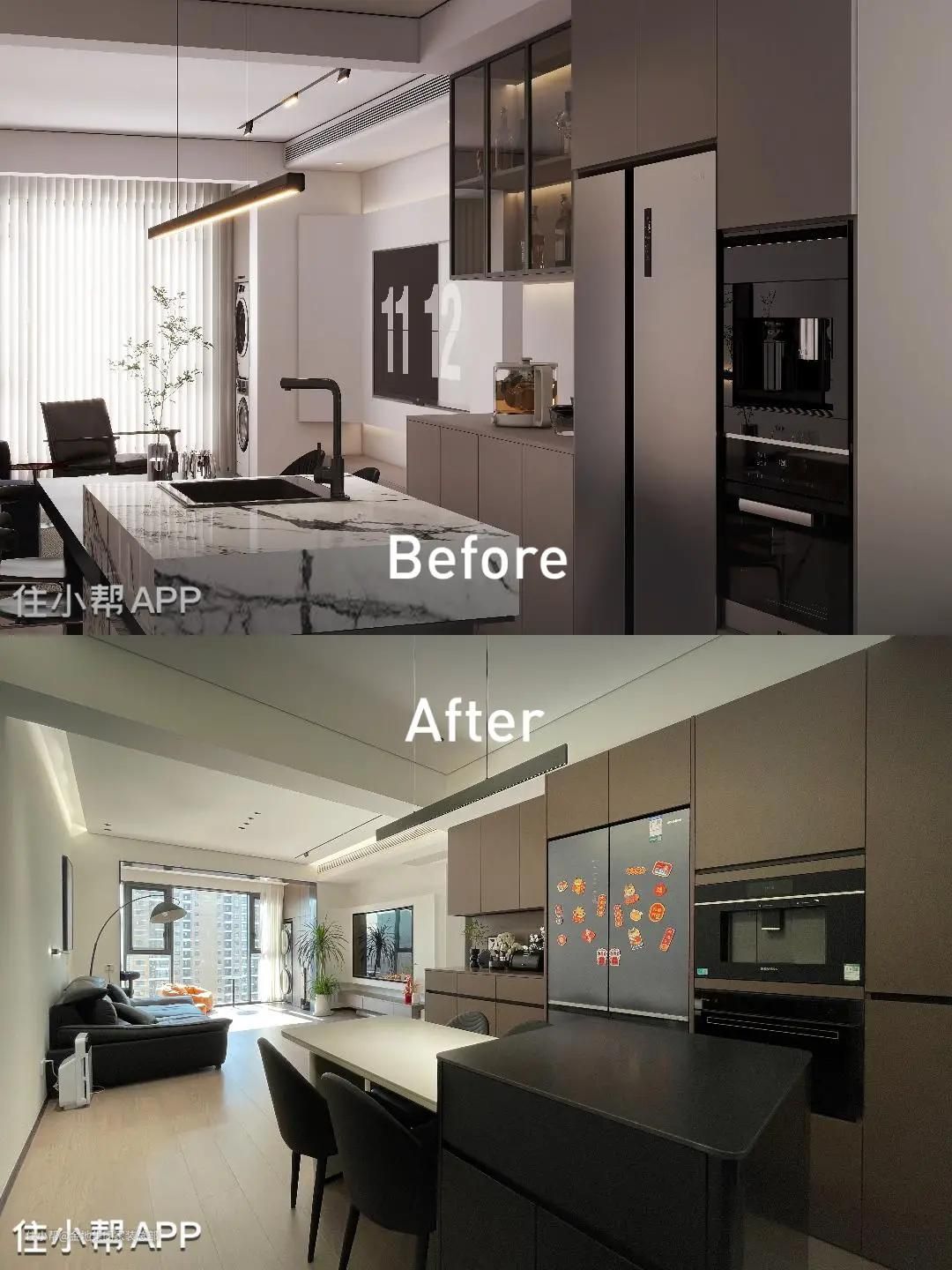 上面是效果图和实景图的对比。 本案例来自武汉同鑫花园,为旧房毛坯翻新项目,购房面积85平方米,套内面积62平方米。🧑由金地新家高鑫老师进行设计。 房屋常住人口有四人,一对夫妻带着两个小男孩,房主想要一个开放式的厨房和岛台,家里也能显得亮堂些。因此需要重新规划空间布局,将主空间做无隔断的设计,提高了整个空间动线的灵活性和采光。