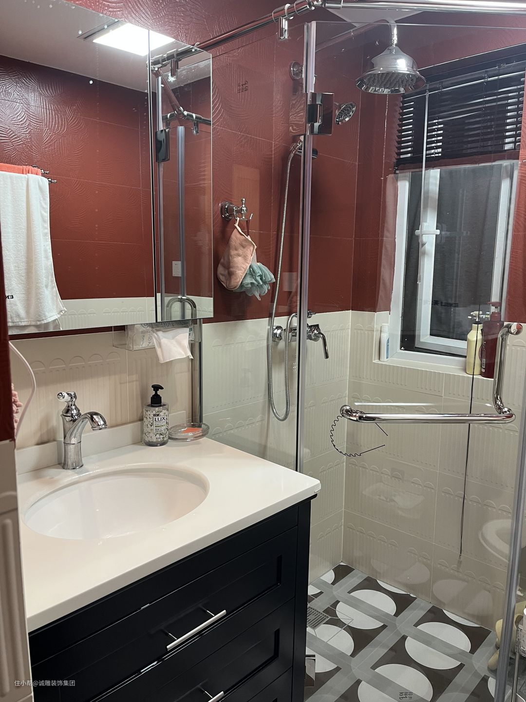卫生间由于面积问题,用淋浴房来实现干湿分离,复古红加上米白撞色墙瓷砖,搭配地面黑白花砖,黑色陶瓷一体盆,简洁与美达到极致平衡。