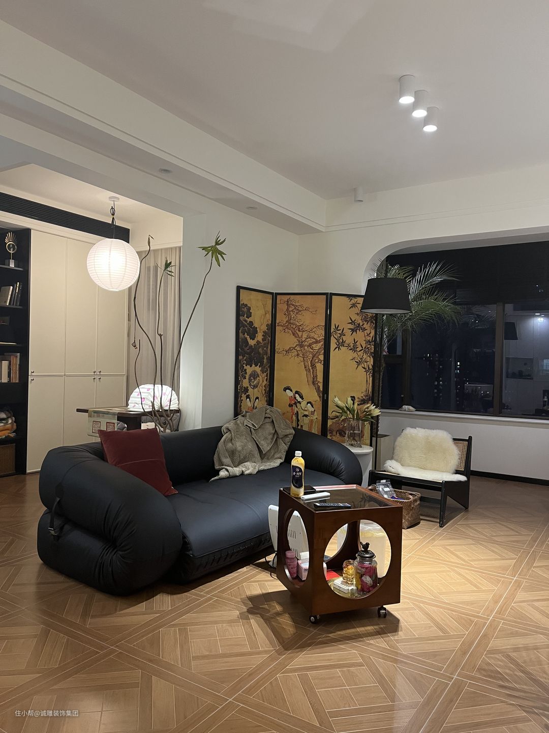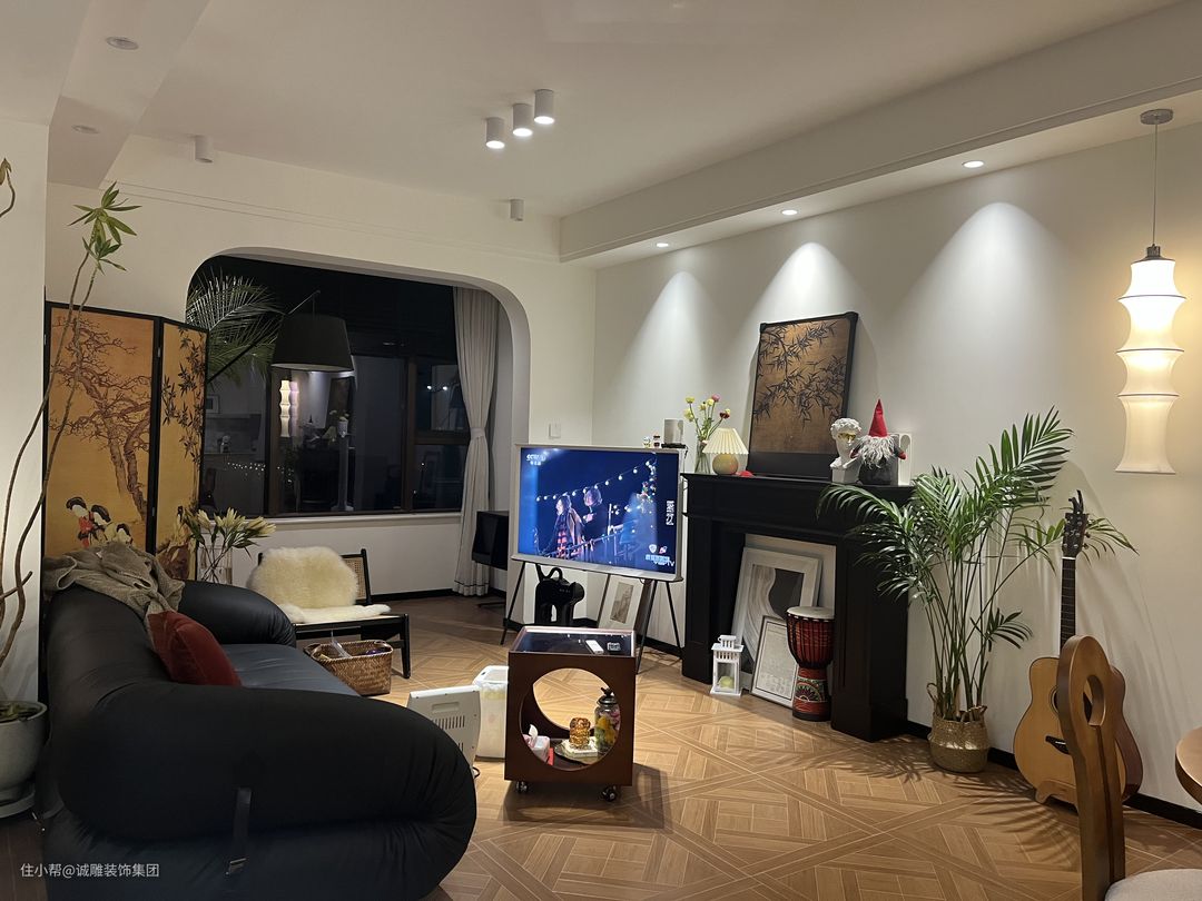 黑色沙发旁的复古屏风与壁炉上的装饰画相互呼应,搭配复古的小茶几,使空间双倍的高级感,给空间增加艺术感