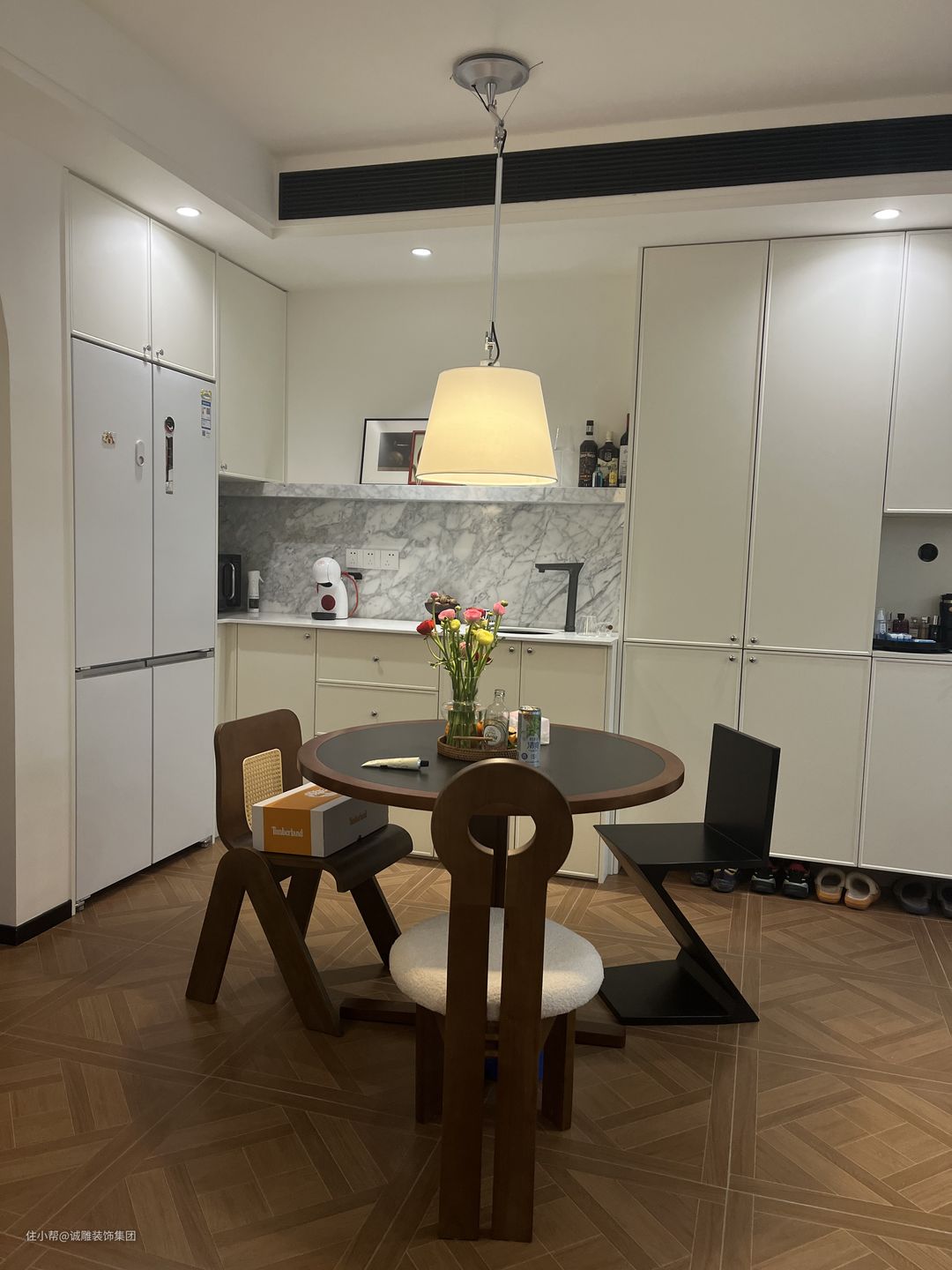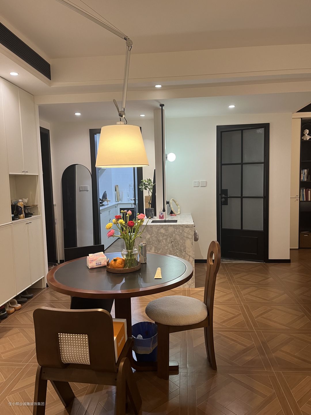 胡桃色的圆形餐桌灵巧精致,搭配3把不同造型的餐椅组合个性十足。满足平日一家人使用,传统的酒柜区域设计了西厨,中厨做饭,西厨喝茶,惬意极了