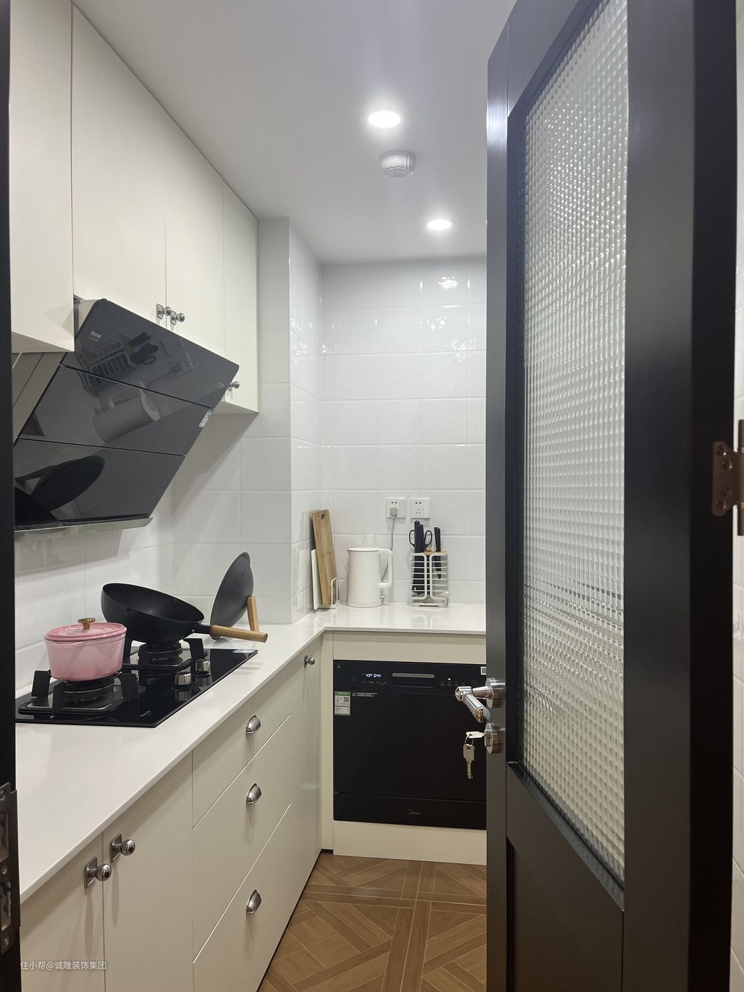 厨房设计以简单实用为主,以白色为主,计让空间看起来更加整洁,搭配银色的拉手,让整个厨房更加的有质感