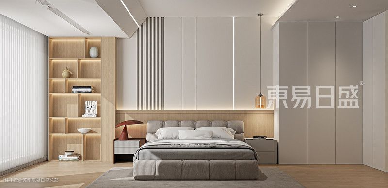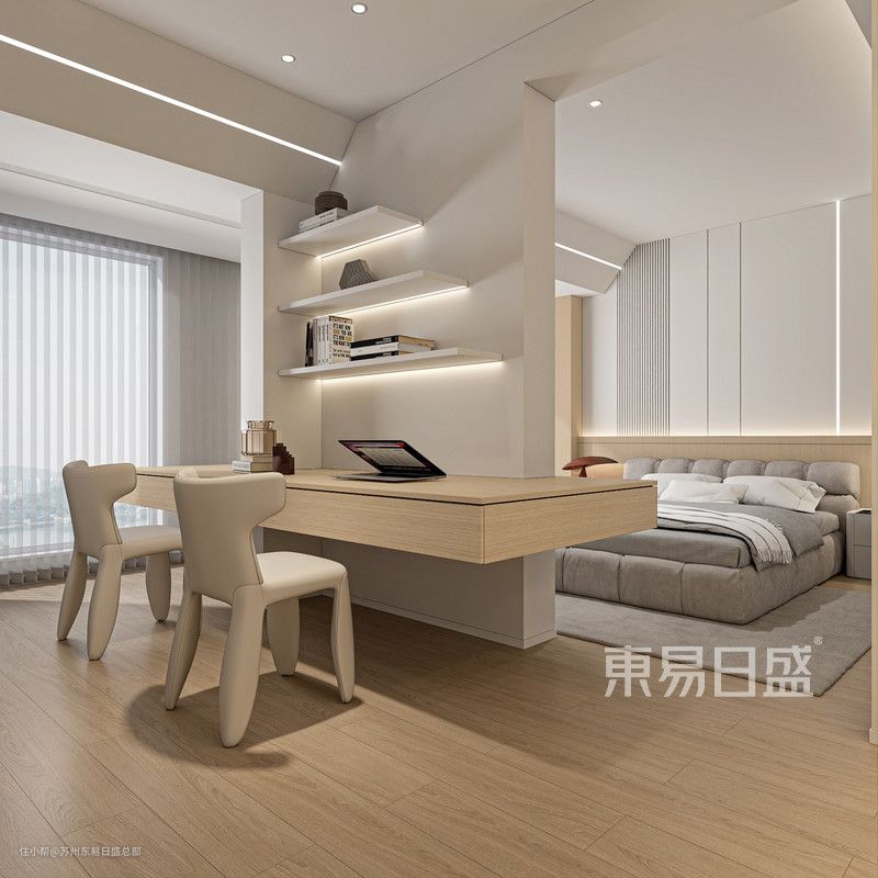 卧室设计简洁、明亮,条纹落地窗设计让整个空间的采光更加充分,简单的壁桌设计,不仅能够作为梳妆台也能够作为办公桌、书桌使用。