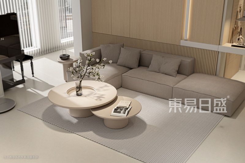 客厅设计以简单的线条勾勒,暖融融的短绒地毯,浅灰色的布艺沙发,加上简单而又富有创意的双拼圆桌茶几,让整个客厅显得既整洁而又温馨。