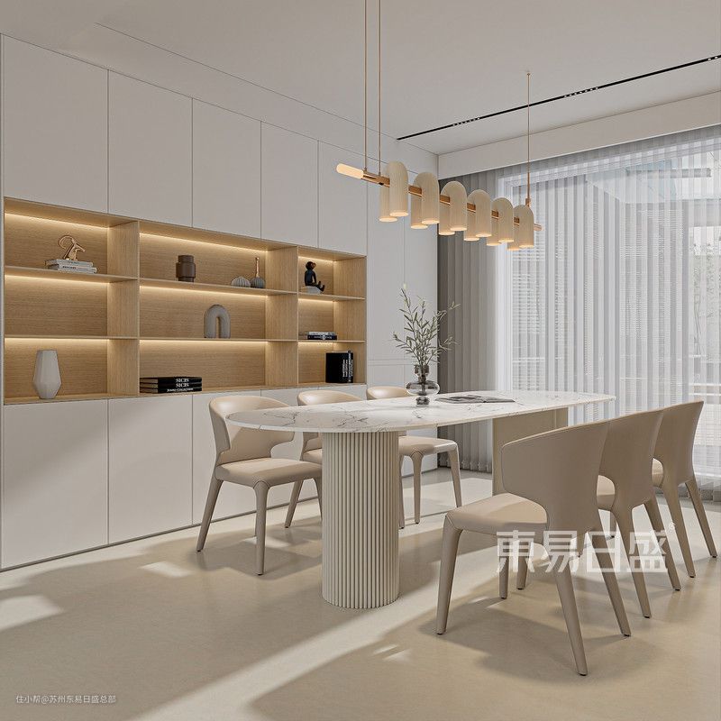 餐厅设计采用椭圆形长桌设计,浅色桌椅设计简约而又温馨,暖色系的射灯设计,既能满足照明需求,又能为就餐环境增添一份浪漫温馨的氛围。