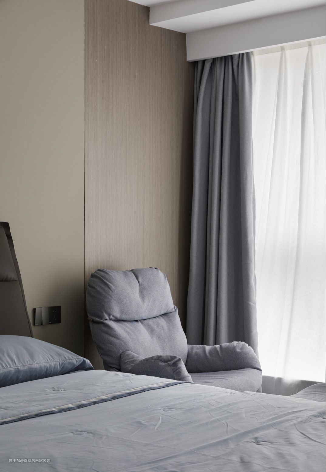 主卧浅棕色墙面搭配低饱和色调家具,蓝灰色的床品与窗帘相互呼应,丰富了空间色彩,仿佛时光也慢了下来,悄然融化了身与心的压力。 主卧室原有宽度较小,将床头背景造型与衣柜结合,使床头背景延展开来,加持深咖色床头板素雅的色彩放大卧室的视觉感受,营造舒适的睡眠环境。