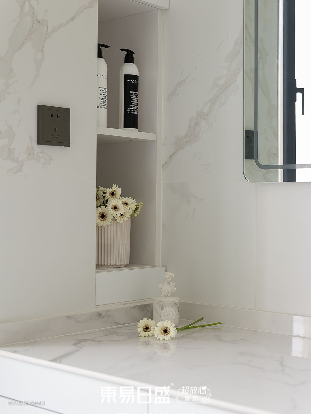 屋主坚持要有浴缸,但原来的卫生间只能满足传统的淋浴和洗漱需求。设计师进行了墙体改造,利用次卫的空间扩展了主卫,在有限的空间内实现了四分离式的多功能卫生间。 主卫的墙面全部铺上了白色大理石纹岩板,不仅美观而且防潮;洗漱台的台面尽可能长,墙壁上还设计了壁龛和入墙式储物柜,更方便实用。
