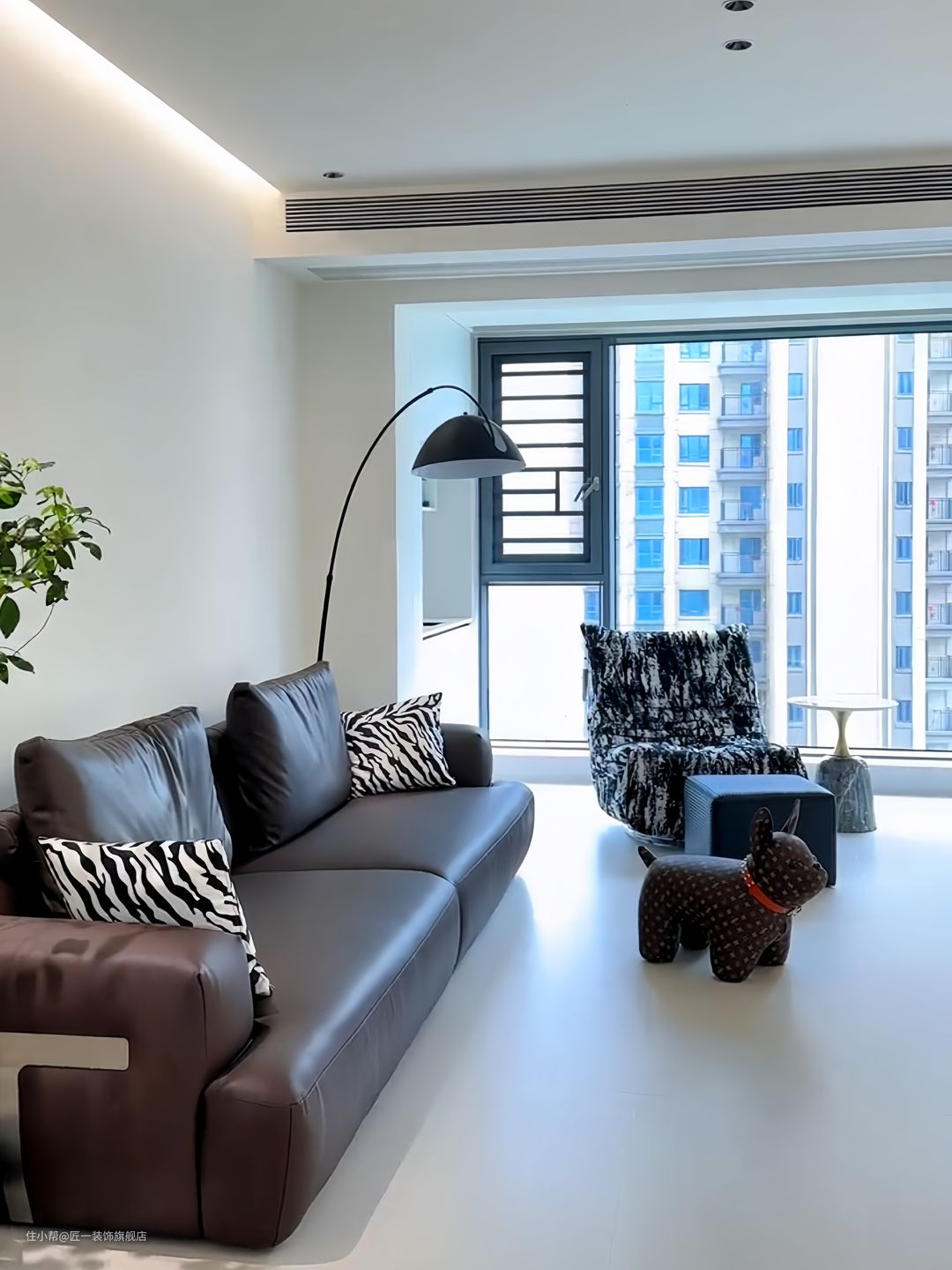 客厅与阳台打通,去除推拉门,使视野更加开阔。 在大落地窗前摆放黑色的皮质沙发,搭配白色抱枕和岩板茶几,营造出舒适而时尚的氛围。