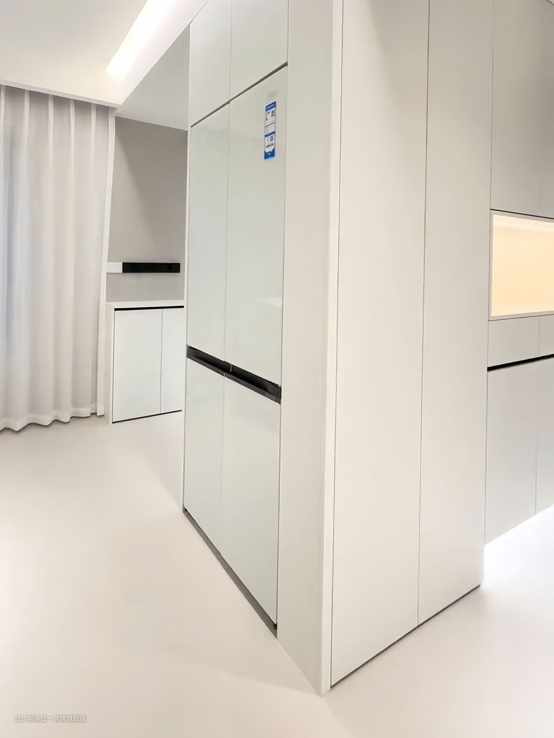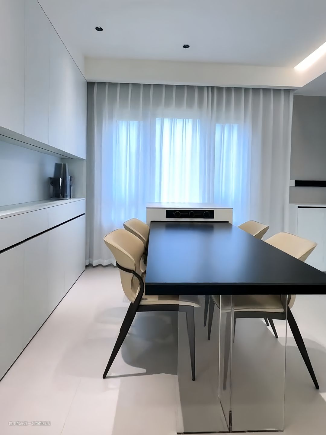餐厅区域增加一组白色的餐边柜,柜子整体内嵌,与黑色哑光岩板餐桌岛台一体设计,既增加了储物空间,又使空间更加整洁有序。