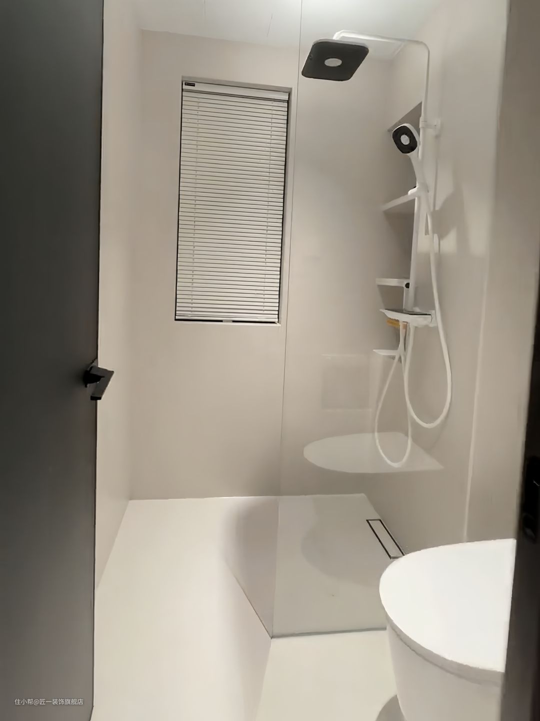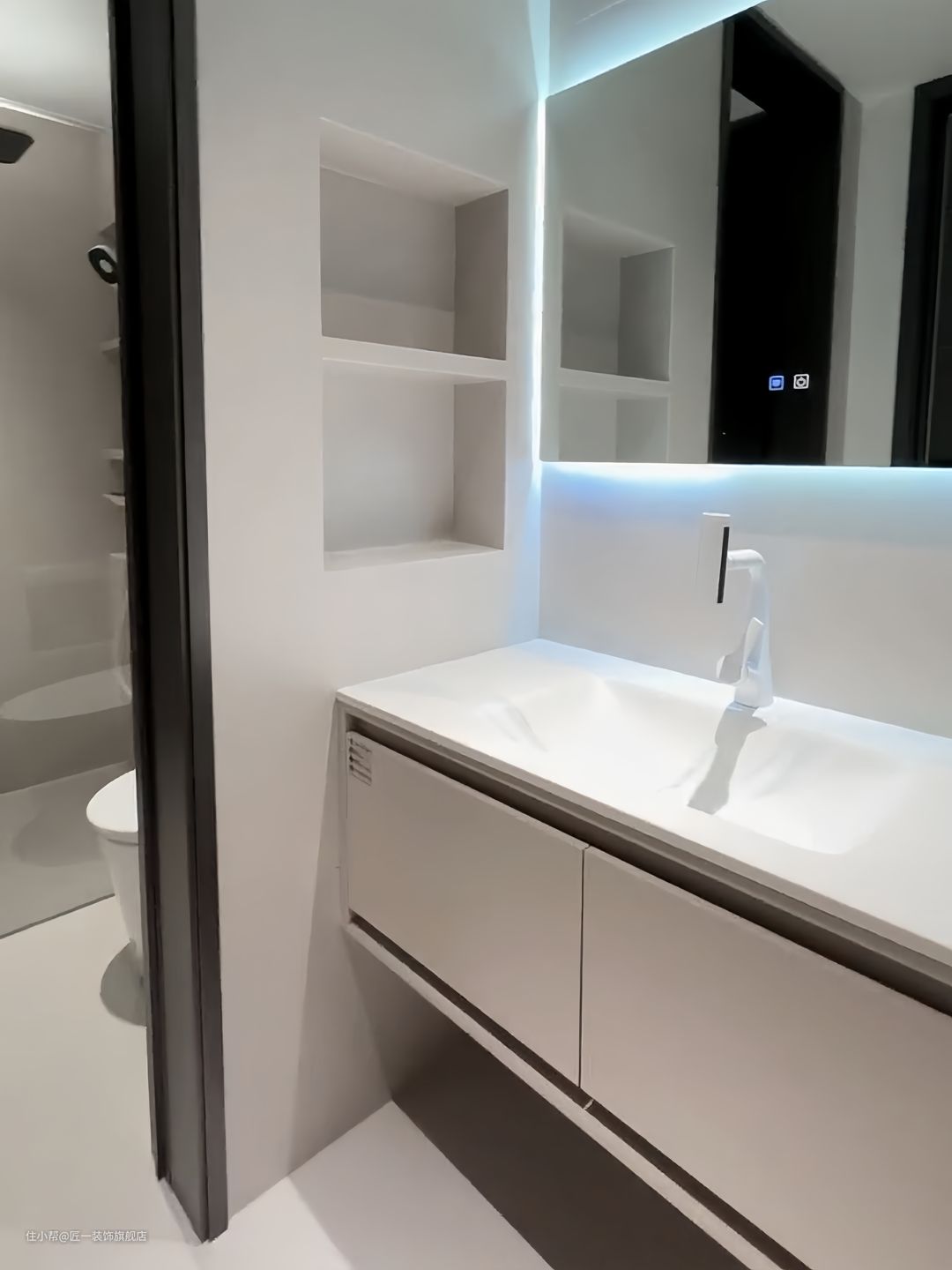 卫生间干湿分离,洗手的外置墙面和地面都铺贴奶油哑光瓷砖,显得非常有质感。干区洗手台隔墙做壁龛收纳浴室柜选择悬空设计岩板陶瓷一体盆,既美观又实用。墙面上安装智能浴室镜,镜柜一体设计,方便收纳和整理物品。