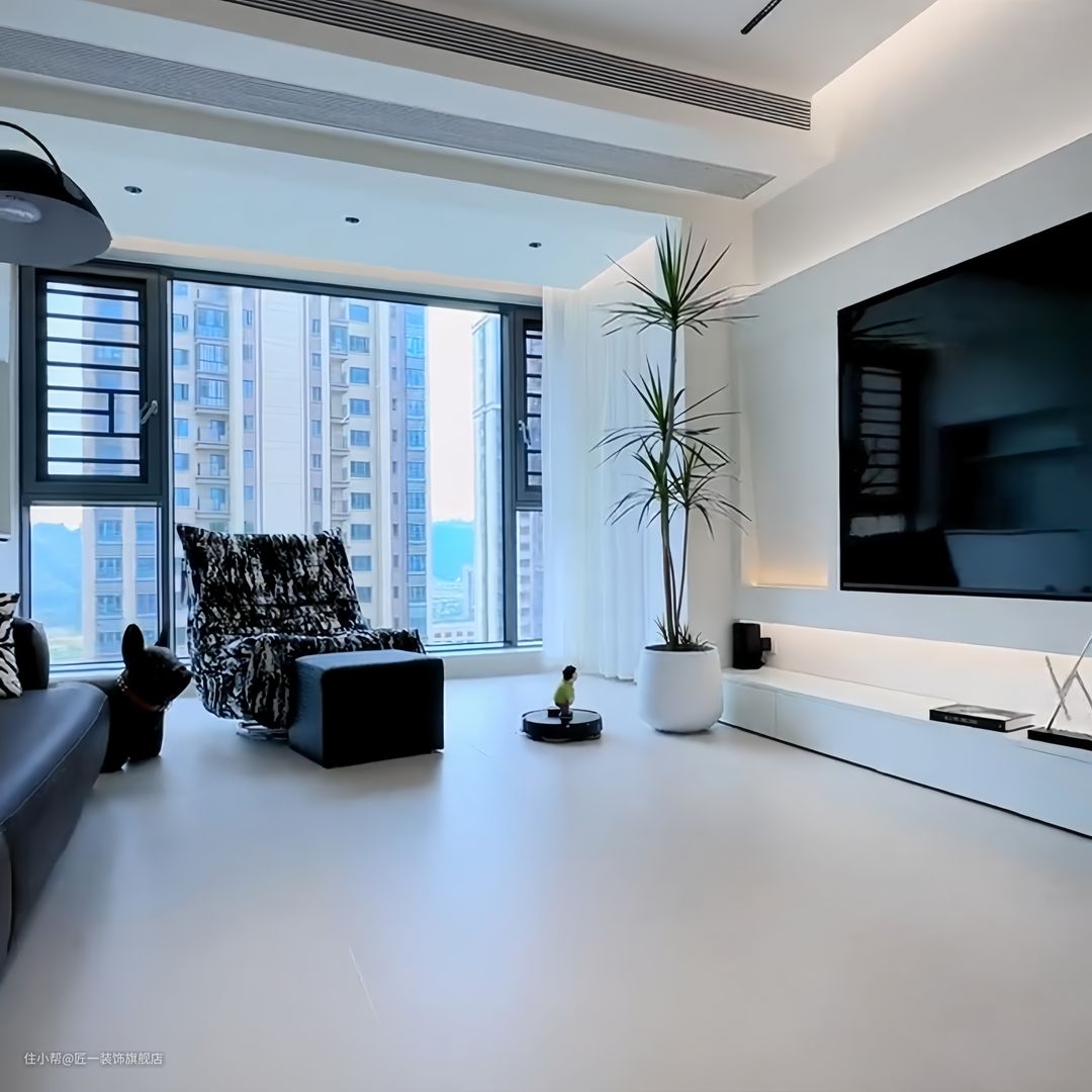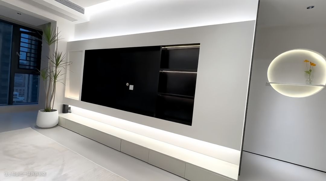 整体空间以奶油哑光灰色瓷砖铺贴地面,呈现出优雅而低调的质感。电视背景则采用石膏板悬浮电视背景设计,为空间增添了几分轻盈与现代感。搭配白色的落地电视柜,整个客厅显得简洁而明亮。为了充分利用阳台空间。