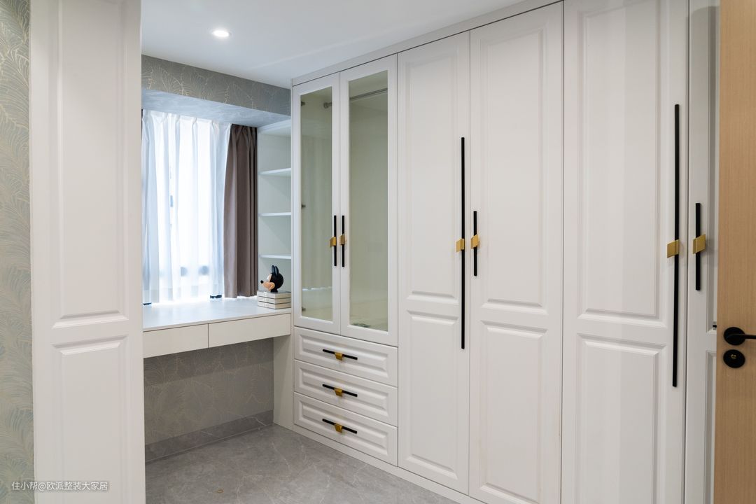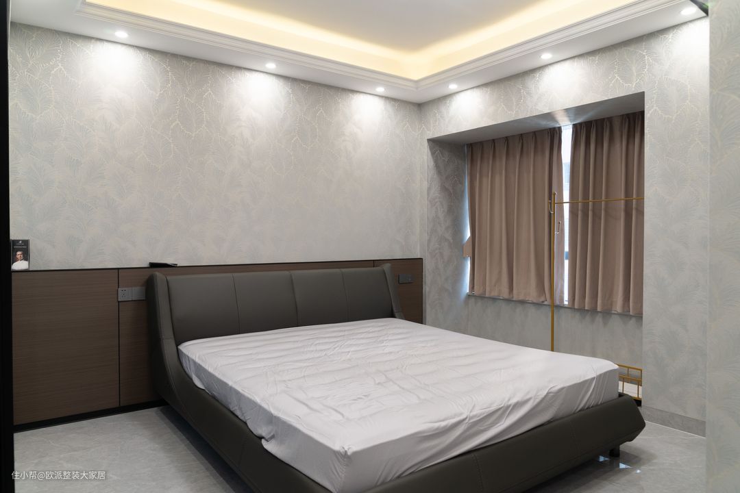 设计师将原户型的两室合并成主卧,增加主卧空间以达到户主想要衣帽间的需求,主卧进门看到的是衣帽间,步入式衣帽间实用性更强。 选用奶白色柜体,长短不一的黑色把手边加上金色的点缀,瞬间设计感吗,满满,两排的置顶柜安排挂衣区和折叠区以及抽屉,衣物储存也可以分类有序。 床头背景墙采用半墙板的设计,与深灰色的床头很搭配,显示出沉稳大气之感,淡蓝色叶脉墙纸,透露出小清新但是不繁琐 主卧采用回型吊顶,灯光有灯带,筒灯,主灯三种灯源来满足户主对于不同灯光需求,藕粉色遮光窗帘淡雅的颜色是户主对于品质的追求。