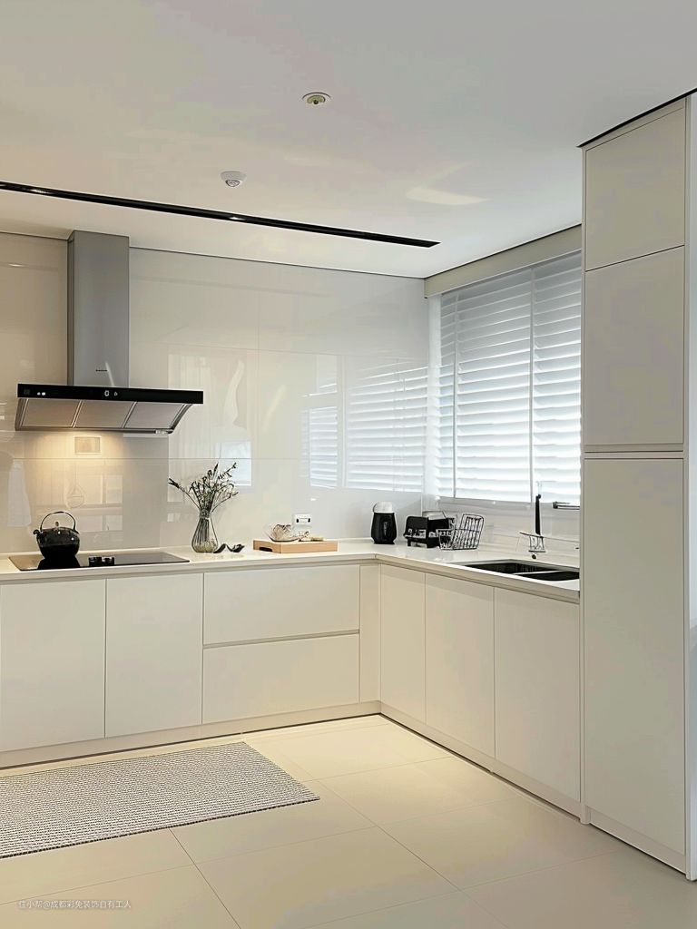 :上方无吊柜设计,让你感觉就像在广阔的草原上奔跑,没有任何束缚。整体 L 型布局,就像一个灵活的舞者,在小小的空间里跳出优美的舞步。窗户和百叶窗,是光线的管理员,让阳光有序地进入厨房。