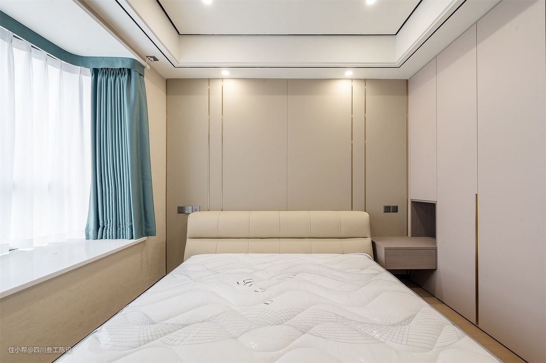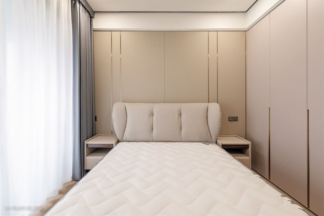 主卧室将进门的地方利用了起来,没有做常规的玄关款式,顶天立地的设计加上陈列柜,做了一个书架,上面放置一些书籍,下面的抽屉可以放一些零碎物品。 主卧的吊顶延续了公区的设计,双眼皮吊顶加上不锈钢线条进行装饰,无主灯设计增加整体亮度,边吊处也安装了光线柔和分散的筒灯,照在墙面减少单调感。 床头背景墙使用米色的护墙板铺贴,增加空间隔音效果,同时中间还增加了金属窄条装饰点缀,空间更显温馨,床头软包隔音防撞,同样奠定整个卧室柔软温馨的基调。 床尾的空间还有富余,按照户主的要求做了定制的书桌,可以办公也可以做梳妆使用,整体的设计打破常规,善于用弧形元素打造流畅百变的空间线条。 床侧的顶天立地柜储物量十足,合理分区,柜面简洁大气,为方便户主开合,衣柜做了金属的长条形拉手,靠床处还做了镂空和延伸设计,代替床头柜,节省空间。
