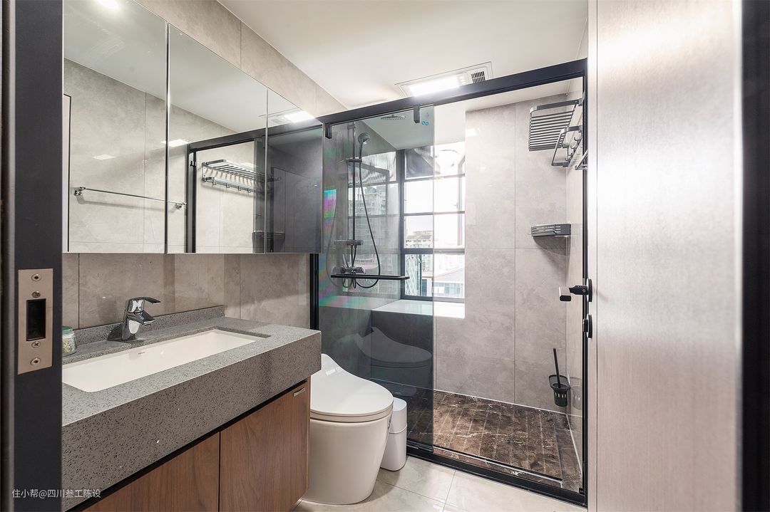 另一个主卫是普通的干湿分离,同样在里面安装了一个淋浴间,并使用黑色透明推拉门做了隔断,地面做防滑设计,略带倾斜方便下水,增加便捷度。 外侧的洗漱区的镜柜有着强大的收纳作用,柜子一直延伸到马桶上方,收纳更足。下面的洗手柜和公卫相差不大。卫生间较小的可以把淋浴间的范围改小,用钻石型或方型的。
