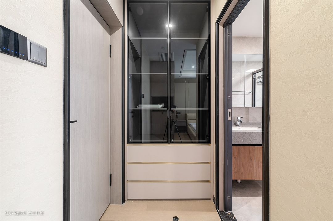 房子的面积不算宽,但带了一个玄关走廊,房内主要做现代风,选了一款仿木纹的防盗门,纹理清晰真实,沉稳且美观度高,搭配黑色门套,显得大气十足。 地面铺设白色瓷砖,颜色明亮带有一定的反射光,空间看着会更加明亮一些,淡淡的花纹不会显得单调,但也不会影响到简洁的空间调性。 侧面安装到顶定制玄关柜收纳,储物量十足,底部提前预留出20mm方便换鞋,同时扫地机器人也可以轻松出入,方便清洁,卫生无死角。 考虑到整体的和谐和美观,柜子没有做外露把手,而是改为了门板延伸,下面的柜子做内扣把手,视觉上大气简约,中间留出放置区,安装灯带增加层次,渲染氛围。