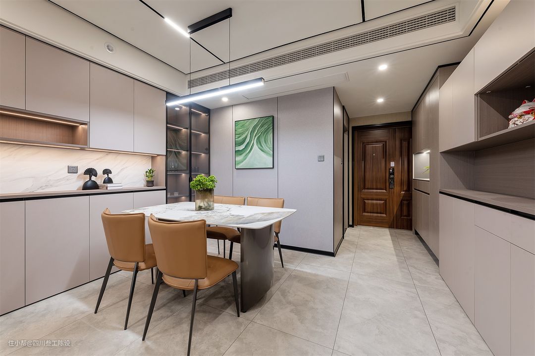 另一边的餐边柜和玄关柜做了衔接,为了与之错开,上面的柜子做了预留,也方便了吊顶上的灯光进行照明,不过这样做会让柜子比较容易藏灰,需及时清理。 颜色上也做了区分,餐边柜的颜色更浅,中间留出放置区和开放格,方便摆件放置,无外露把手,门板延伸的设计更方便使用,旁边还放了消毒柜,日常生活更便捷。 精心挑选的岩板餐桌,纹理清晰美观,结实抗压,且带有耐高温不开裂的特点,油污不易浸透清洁起来十分方便,而皮质餐椅柔软透气,舒适感强。