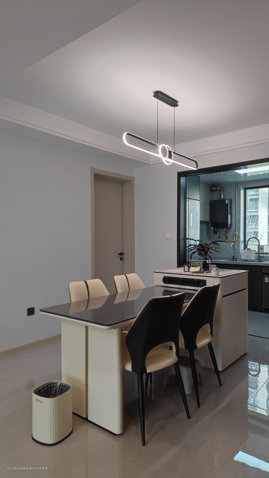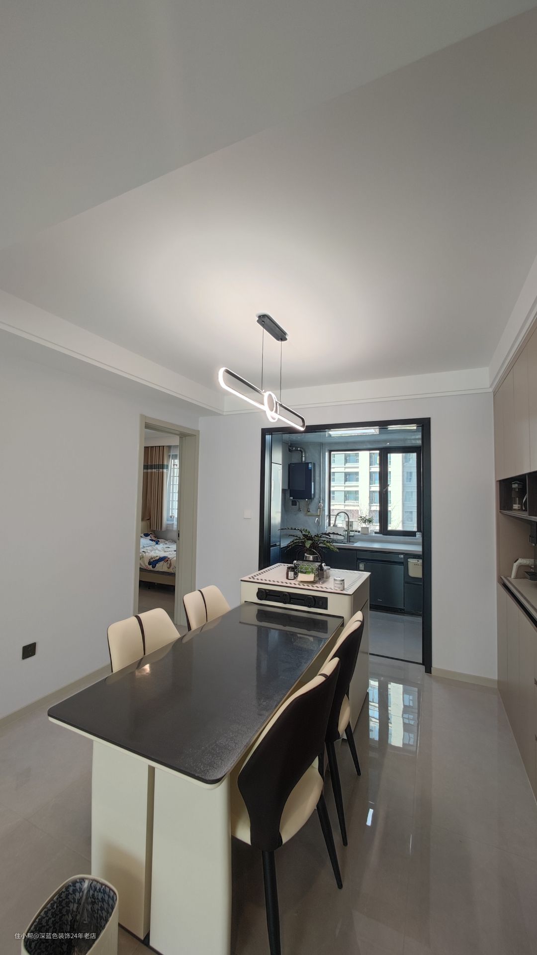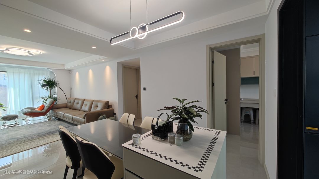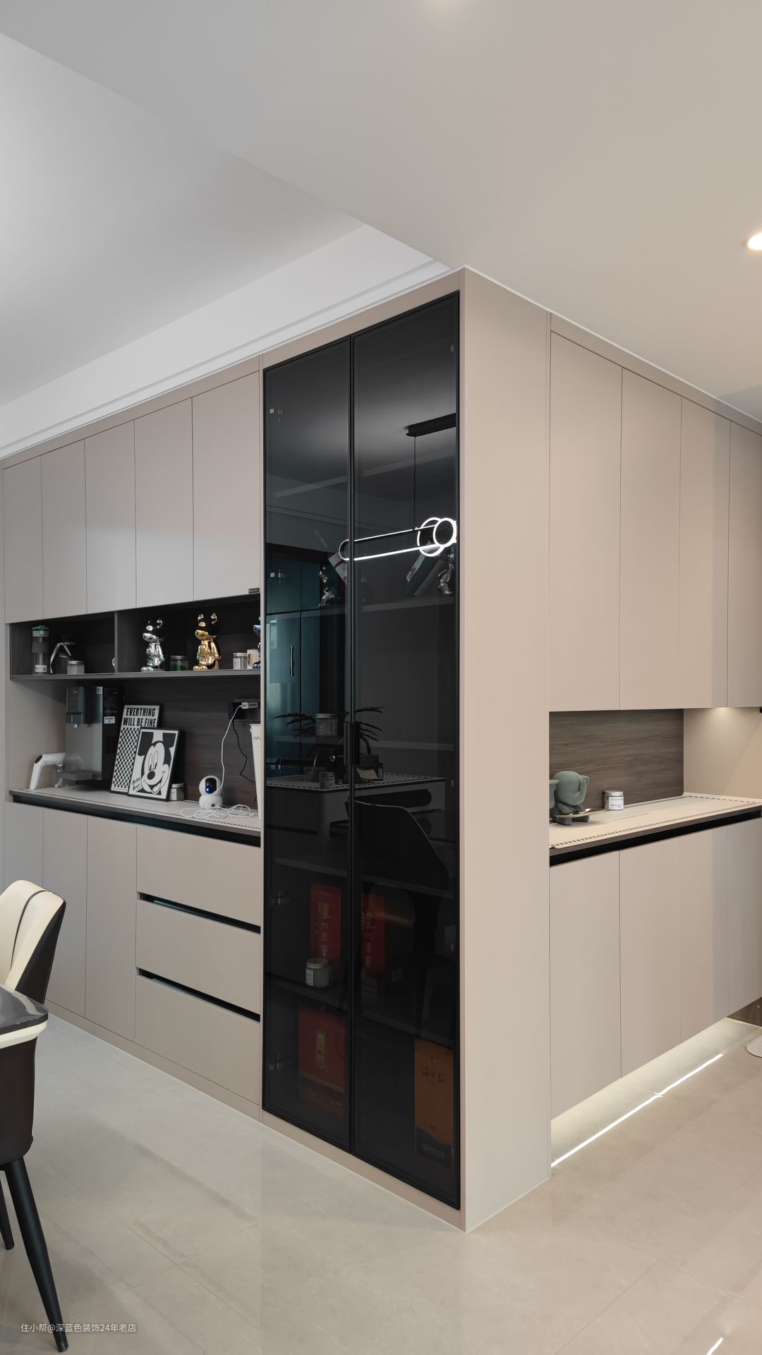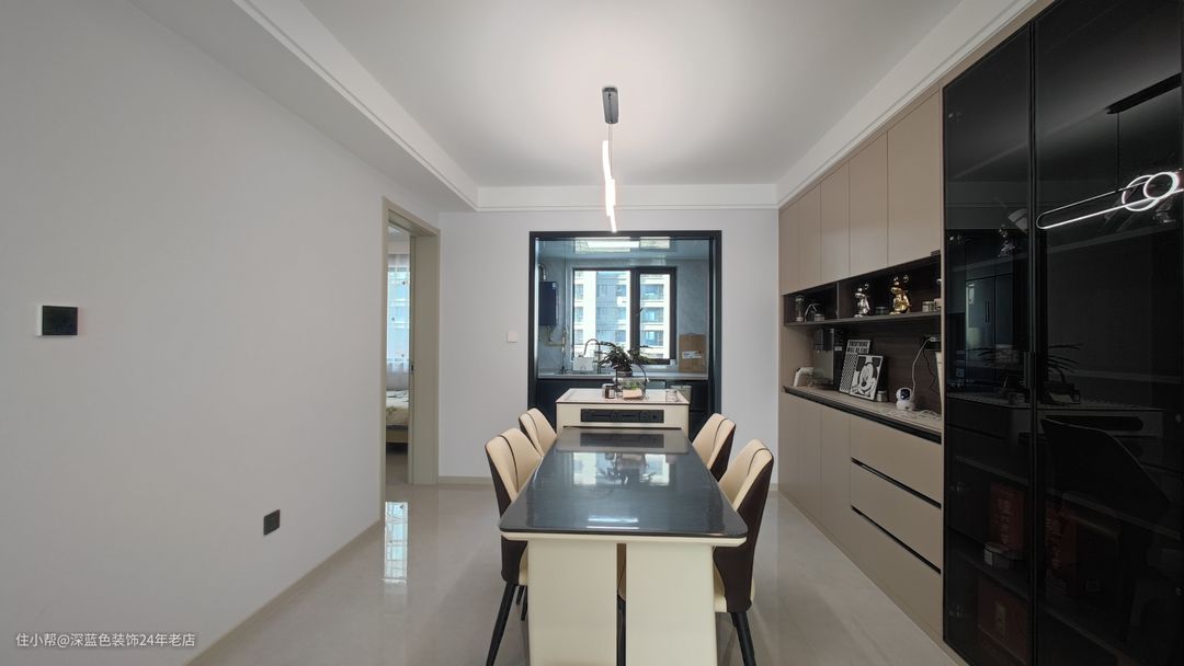 餐厅处风格与客厅基本上保持一致,这样整个家中空间就更加具有整体性;餐岛一体餐桌既方便家中日常的就餐需求,岛台处的插座也可以将餐桌变成工作台,给手机电脑充电不在话下;餐边柜与玄关的柜体链接,一致的颜色将不同功能分区连接在一起,哑光的柜门与其他家具进行呼应,也提升了质感,黑色的玻璃柜门也让整体不那么单调。