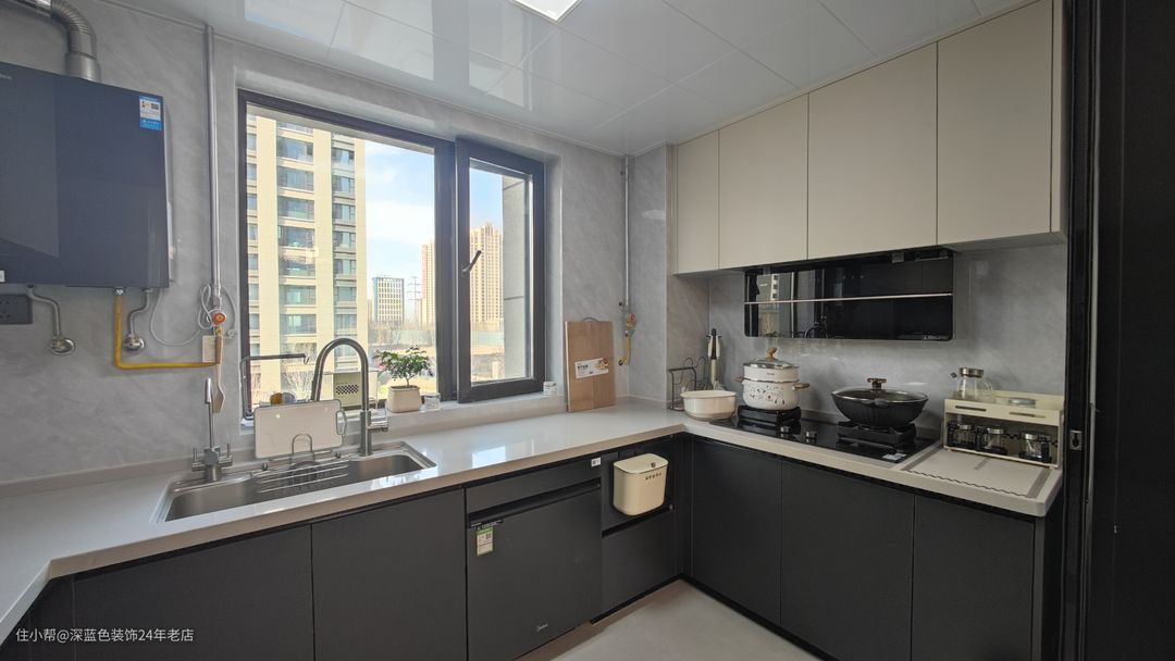 厨房做了开放式的设计,U型橱柜操作空间更大,也能满足多人同时操作;与橱柜颜色一致的冰箱内嵌于橱柜之内,既满足“拿洗切炒”的动线流程,还提升了整体的质感;吊柜采用的是与餐边柜一致的米色哑光材质,增加整体性的同时,也不会让厨房有“头重脚轻”的感觉。