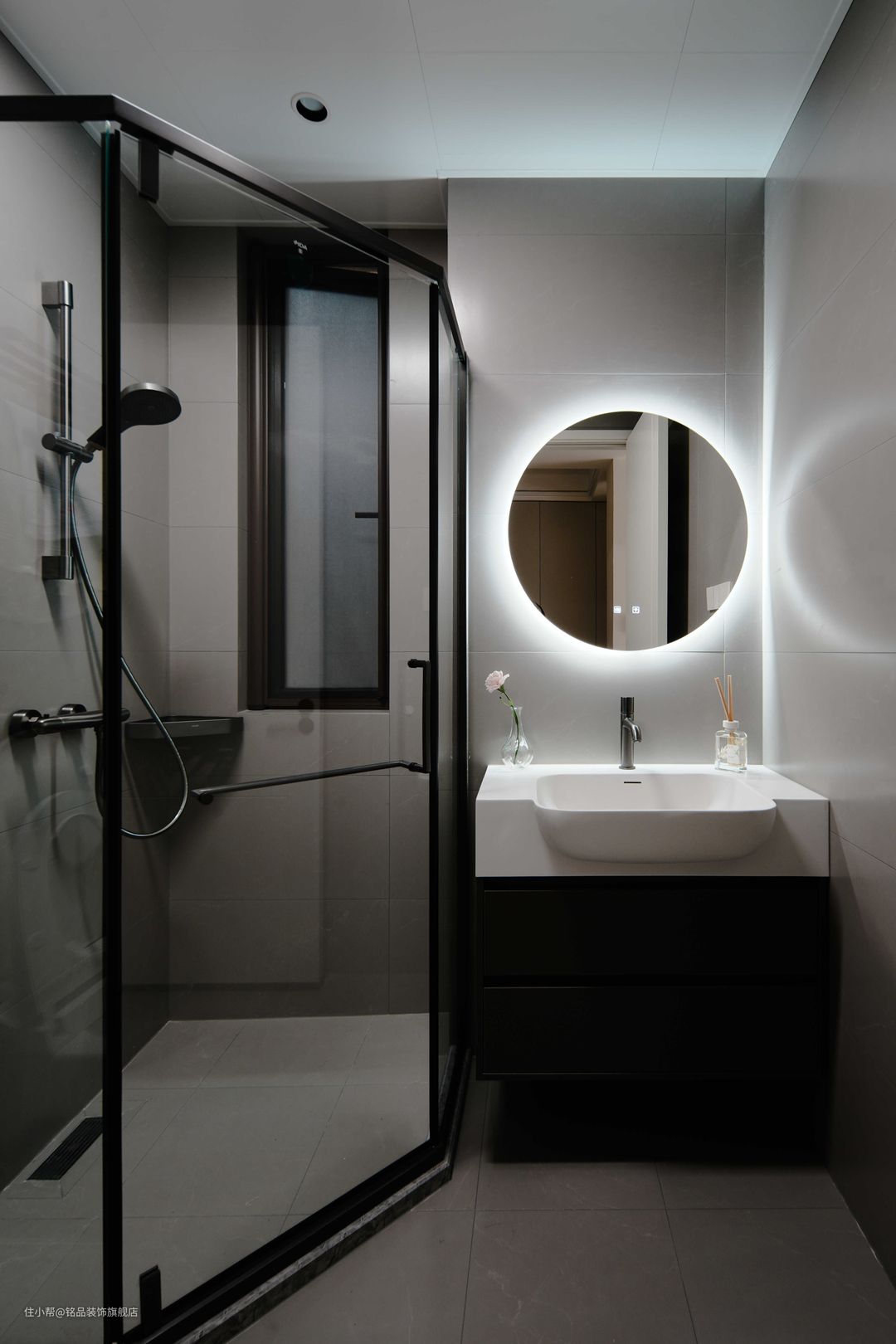 卫生间墙地统一贴灰色系瓷砖,耐脏又显大气。淋浴区是砖石型淋浴房,可以打造干湿分离。台盆区做了台上盆的设计,下方的抽屉可以做收纳储物,墙面用了圆形智能镜,周围嵌入灯带,更有氛围感。