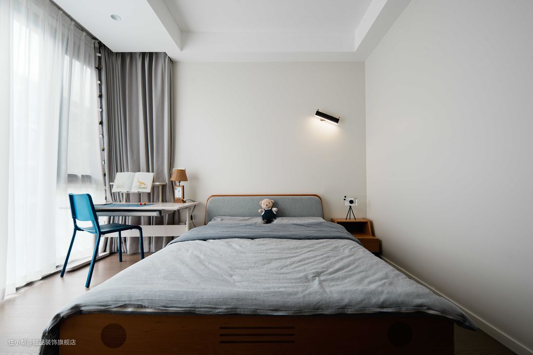 书桌与座椅则构成了孩子的学习角,桌上的书籍和笔记本电脑,见证着孩子知识的积累与成长。 窗畔,轻纱曼卷,随风起舞,隔离喧嚣,为孩子营造了一方宁静的学习和休息天地。
