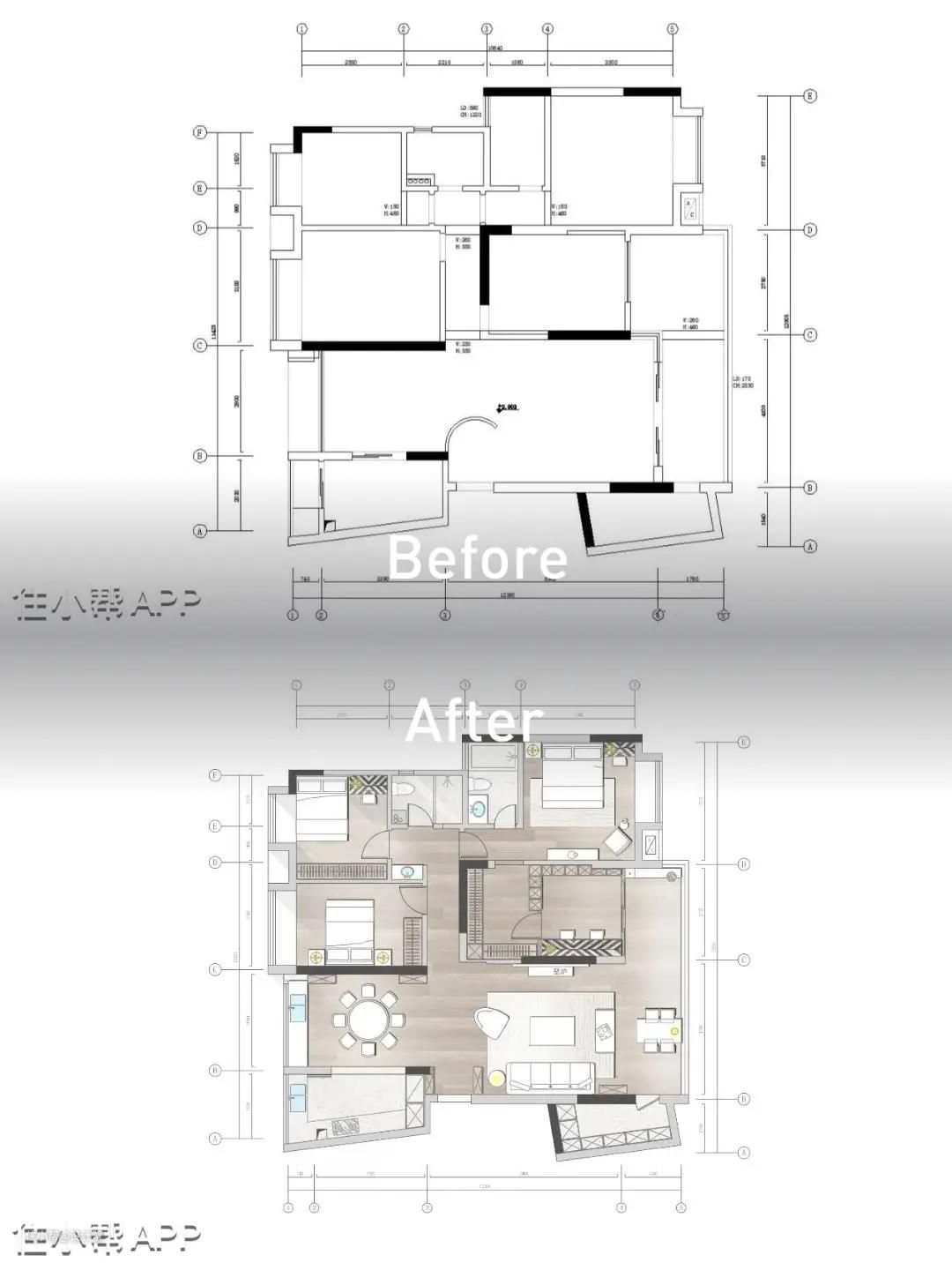 这套 160㎡ 的房子位于广东广州,屋主是一对年轻夫妇,喜欢浪漫且暖色调的现代风格。 户型缺点: ①、原户型进门对着公共卫生间,虽然原屋主做了一个圆形玄关遮挡 ,但这也把客厅和餐厅隔开了,本就不大的公共空间再次被分割, ②、贯穿式的大阳台提供了非常好的景观面,但是缺少合理规划导致阳台使用率低造成空间浪费。 ③、同时屋主还想要的衣帽间、书房、茶室等功能没办法满足。
