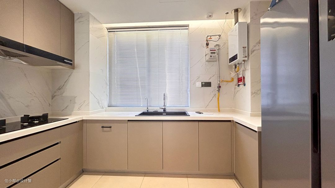 厨房同样表现出色。不锈钢的冰箱、水槽和烤箱不仅实用性强,而且与整体风格相得益彰。它们的简洁线条和冷色调与橱柜的白色和大理石纹理形成了完美的呼应,让整个空间更加和谐统一。