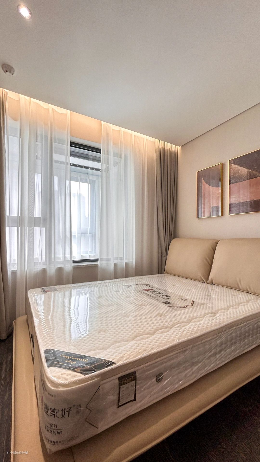 次卧整体色调以白色和米色为主,营造出一种简洁、清爽的氛围。通过巧妙的线条和色块搭配,设计师成功地打造出了一个既符合现代审美又具有实用性的卧室空间。 这个卧室的床头背景墙采用了弧形设计,打破了传统直线的束缚,为空间增添了一份灵动与变化。同时,隐形灯带的设置更是巧妙至极,它不仅为空间提供了柔和的照明,还使得整个床头背景墙更加立体、有层次感。 衣柜采用了嵌入式设计,既节省了空间又增加了实用性。衣柜内部的布局合理,方便存放各种衣物和物品。同时,衣柜门的颜色与整体风格相协调,使得整个卧室看起来更加和谐统一。