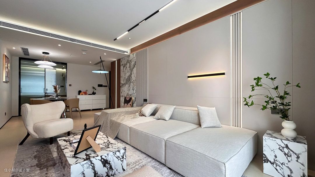 在色调方面,整个客厅以白色、棕色和灰色为主,营造出一种简约而温馨的氛围。这种色调搭配既符合现代家居的审美趋势,又让人感觉舒适、放松。 弧形电视背景墙,这种设计打破了传统直线背景墙的局限,以柔和的弧形线条营造出更加舒适、自然的视觉感受。两个平板电视并列摆放,不仅提升了空间的科技感,也满足了家庭成员多样化的观看需求。电视柜则采用了黑色设计,与整体色调形成对比,更加突出了电视背景墙的焦点地位。 在材质的运用上,这个客厅也做得相当出色。原木与木饰面结合的电视背景墙,既保留了木材的天然纹理和色泽,又通过木饰面的处理提升了整体的质感和档次。这种材质搭配不仅让客厅看起来更加高档,也给人一种温馨、舒适的感觉。