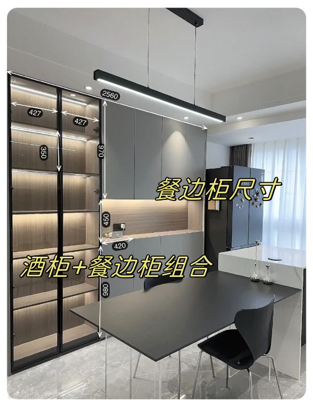 餐厅尺寸为长3.9米,宽2.6米,银梨色的柜体搭配肤感灰的柜门,为您的餐厅增添了一丝温馨和高级感。内嵌的灯带为整个空间增添了柔和的光线,营造出舒适的用餐环境。 餐桌我们采用了极具现代感的悬浮餐桌,亚克力桌腿和黑色岩板桌面的搭配显得非常有质感。 餐桌尺寸为80厘米宽,160厘米长,为您的家庭聚会提供了足够的空间。同时,岛台尺寸为80厘米宽,80厘米长,可以作为用餐区的补充,增加空间的使用率。