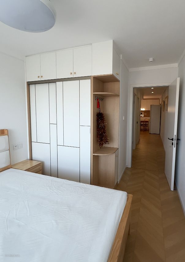 主卧的布置简单实用,阳面的大窗户非常吸睛。 虽然因为空间较小主卧只保留了最简单的布局,但老人必须要有床头柜,放常用药品和老花镜。 衣柜的柜门做成了推拉门,这样一来,开柜子时就节省了过道空间。顶部空间则用来放换季不常用的衣物。 进门处的开放式收纳格做成弧形,让主卧外部的宽敞感得到了延伸,避免了进门拥挤的感觉。