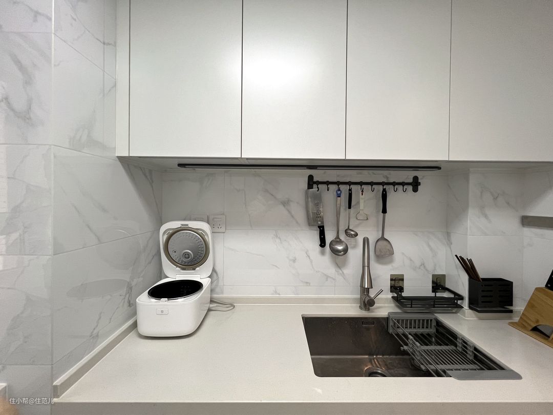 原本的厨房比较狭窄,往次卧阔了20公分后,设计成U型布局,不仅宽敞了很多,收纳力也大大提升。 大面积的白色让整个空间明亮了许多,老人可以很容易地看出哪里需要清洁,避免污渍沉积。 老人做饭频率高,U型的动线设计顺畅省力。为了防滑,还在地砖表面铺上了一层地毯。 上了年纪容易眼神不好,洗碗也容易打滑,吊柜下放都安装了感应灯,灶台下方安装了嵌入式洗碗机,解放双手。