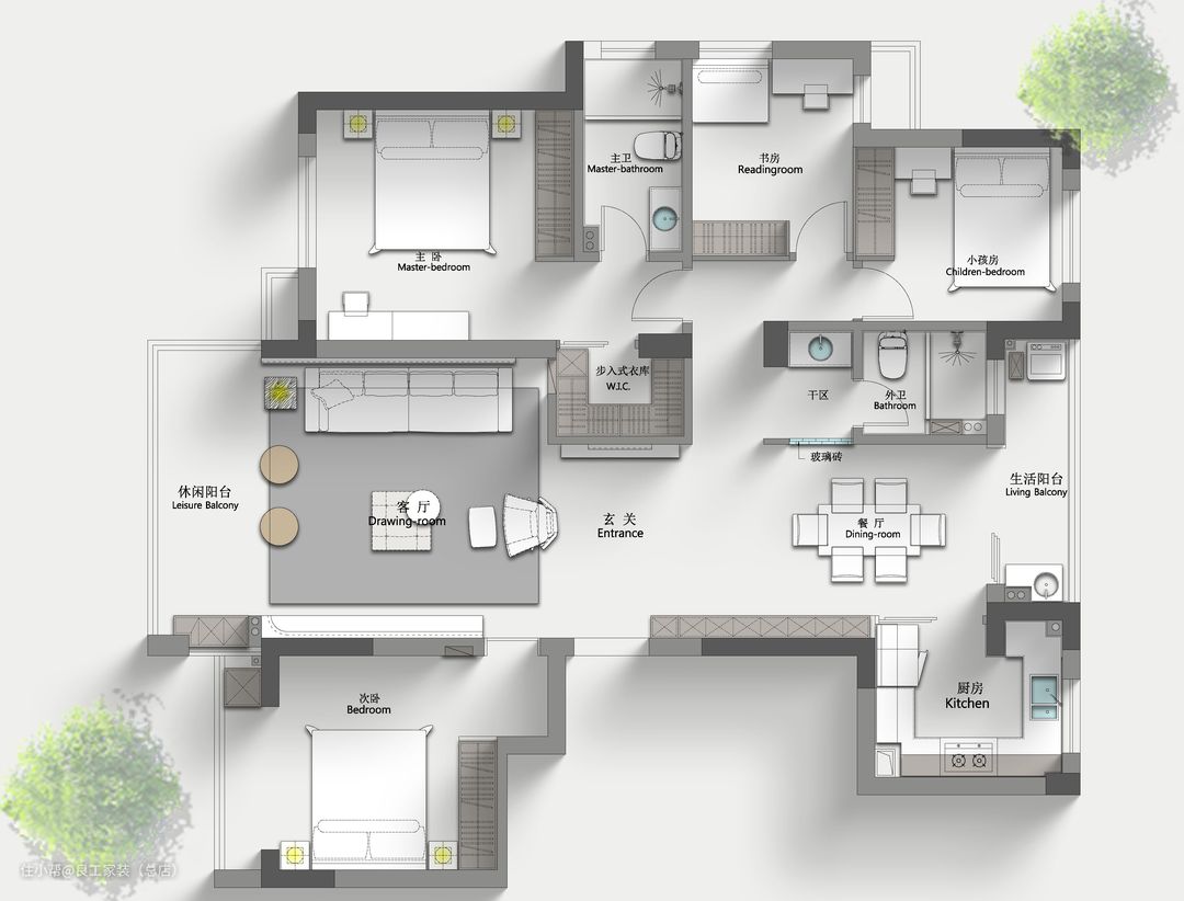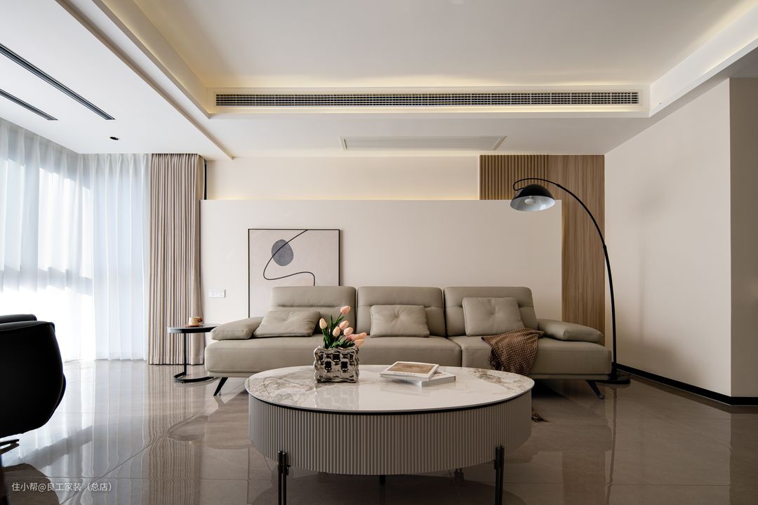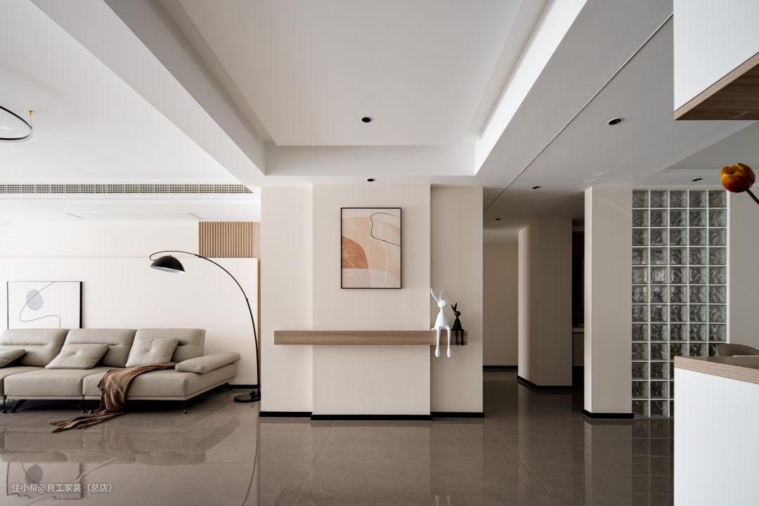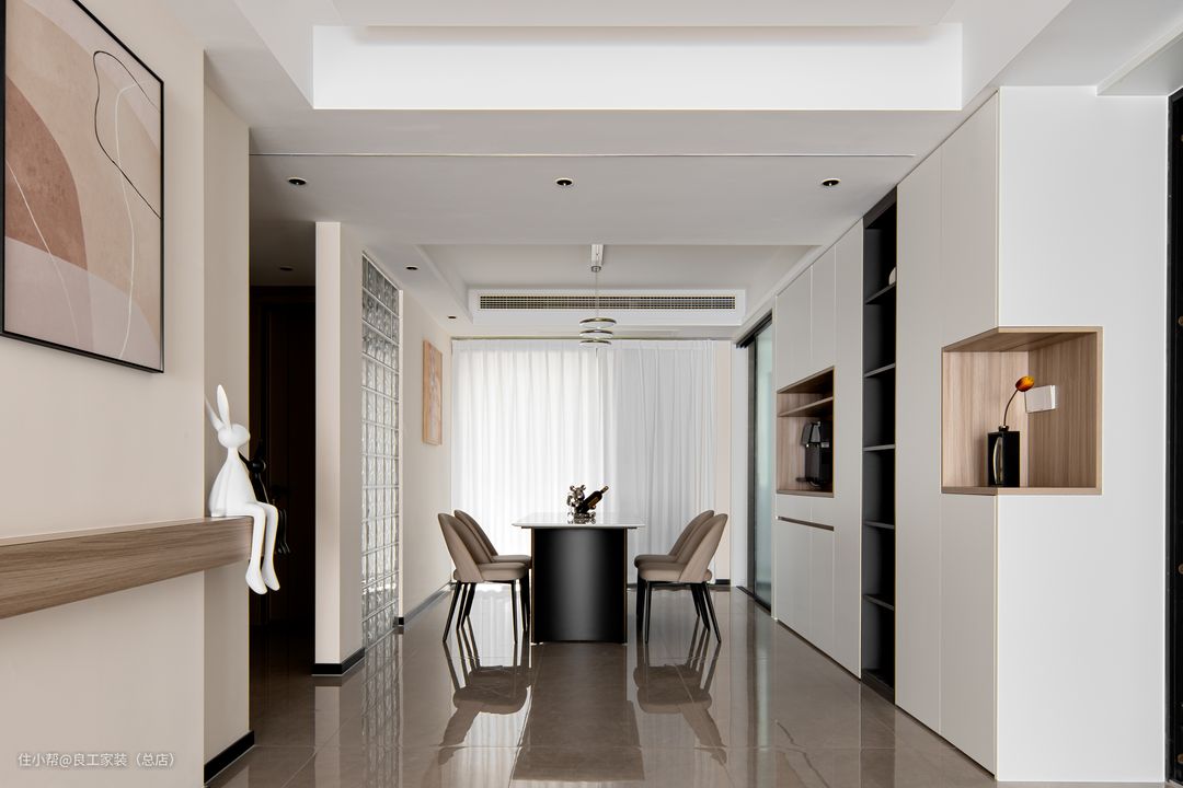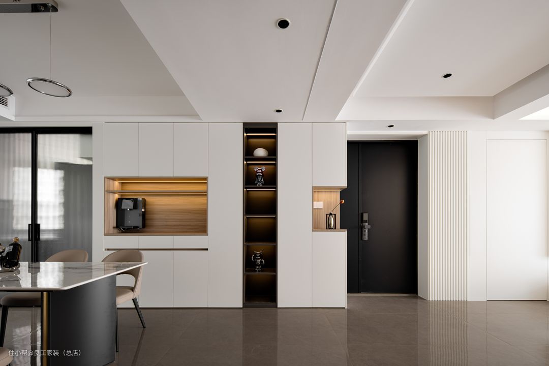 在客餐厅中间区域增加独立玄关,提升入户仪式感。利落有型的线条与块面自由穿插,让几何艺术在简约设计手法之下,展现成优雅的视觉印象。