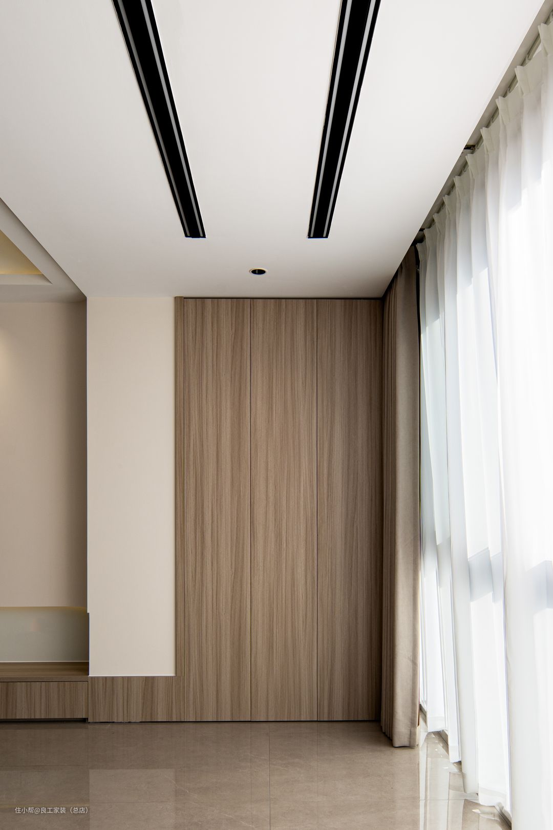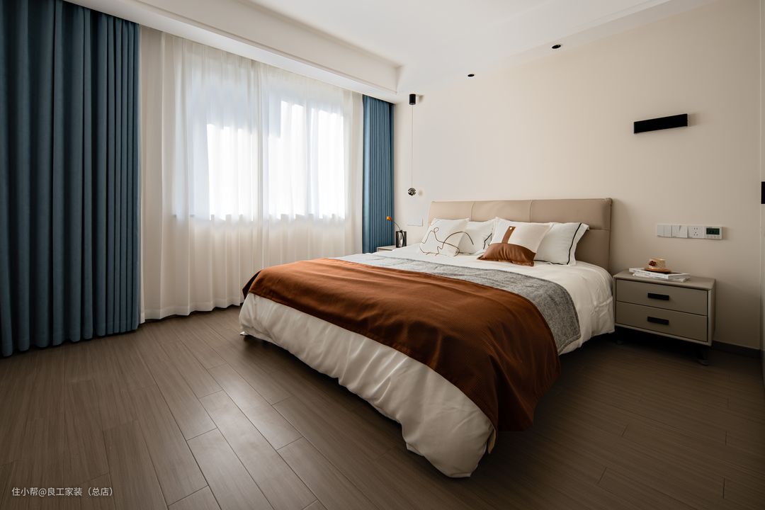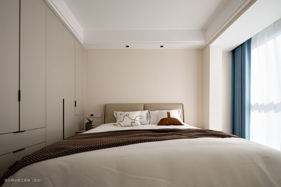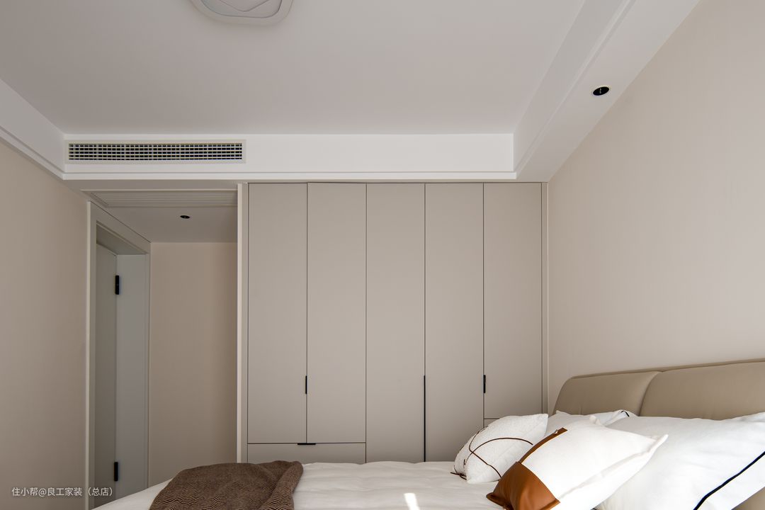 主卧布局合理地利用了空间结构,在配色上也延续了客餐厅的整体基调,浅浅的奶咖色调自带绵绵温情,适合营造出舒适静谧的休憩空间。全屋定制的到顶衣柜,兼具造型美学与储物功能,组成了强大的收纳系统,从而满足屋主的高收纳所需。